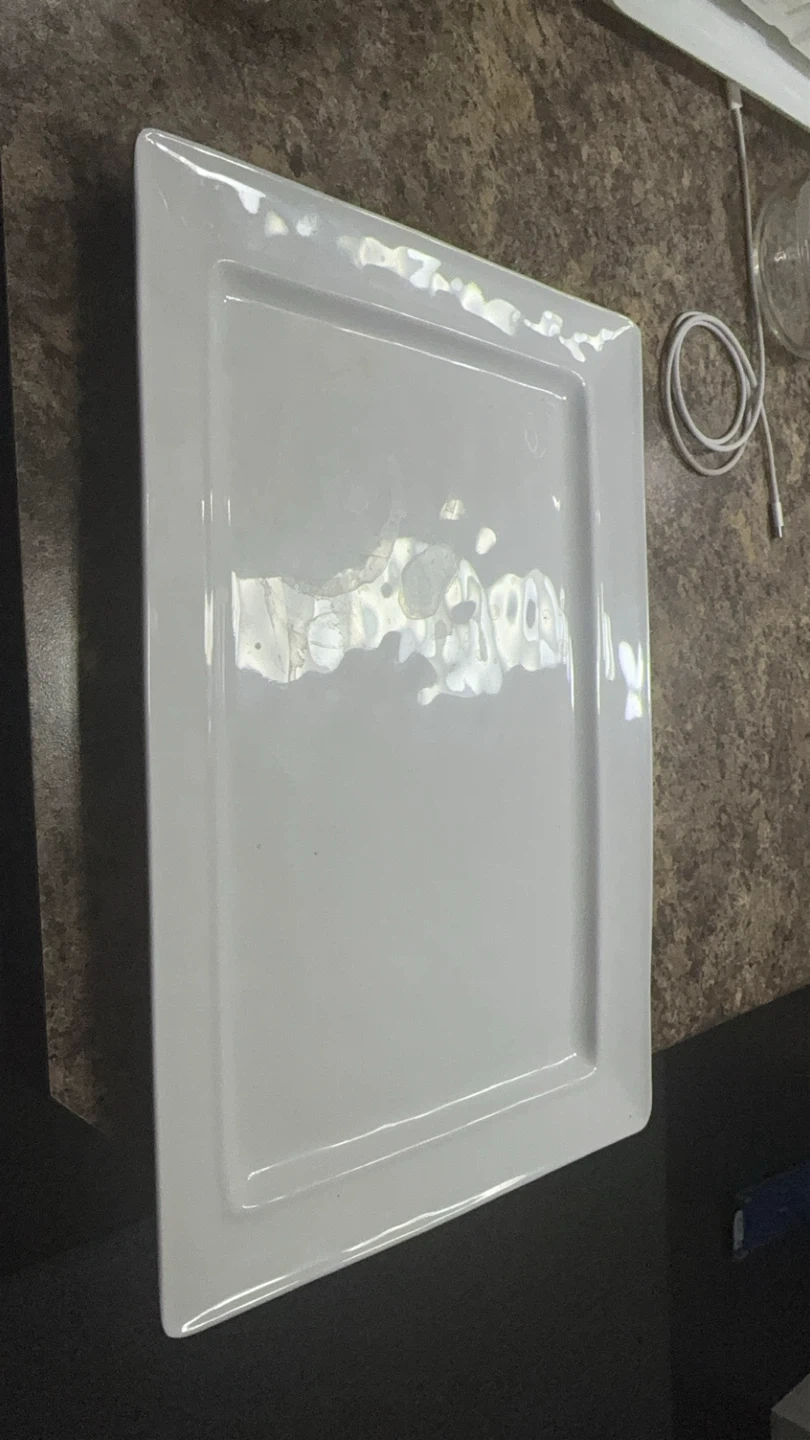Selling a brand new white rectangular serving tray! The dimensions are 35cm x 21cm, and the surface area is 735 cm². It comes in its original box. 20$ per box