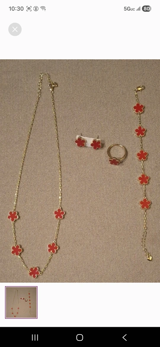 Selling a cute jewelry set with red flower designs! Includes a necklace, ring, bracelet, and earrings. Perfect for adding a pop of color to any outfit