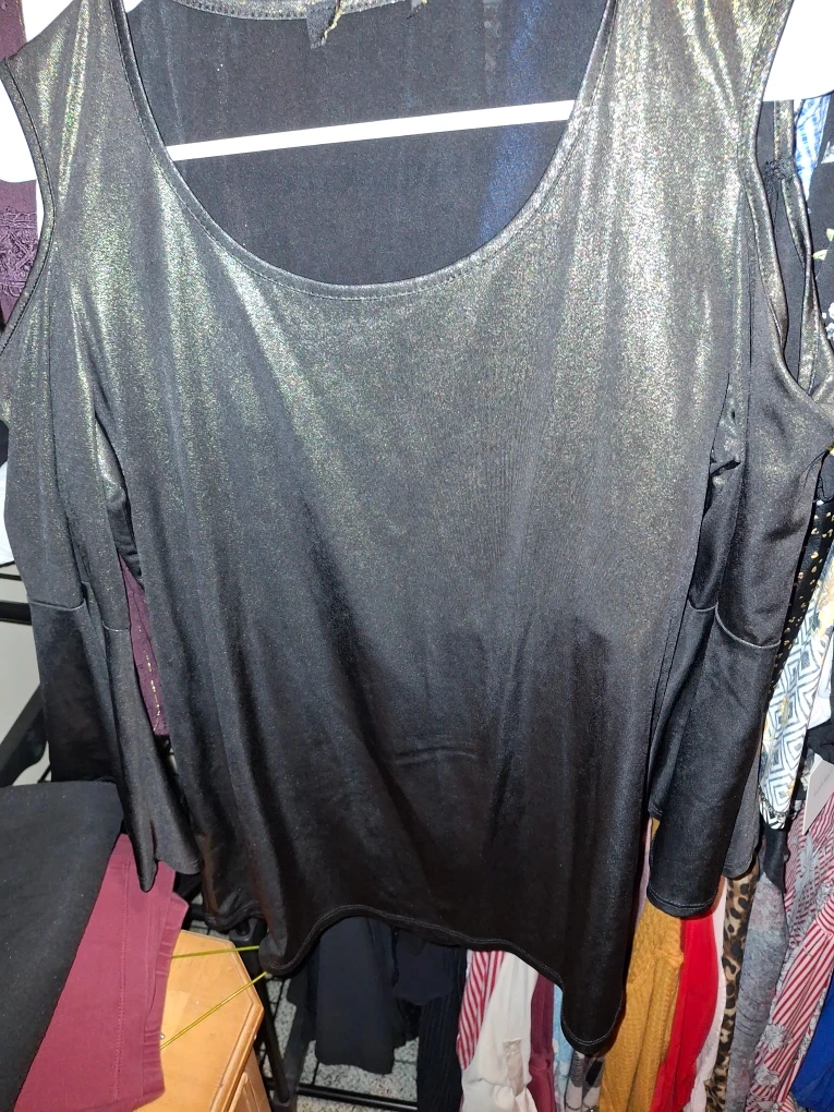 Here's a stylish black cold shoulder long sleeve top! It's perfect for adding a touch of flair to your wardrobe. The top features a unique cold shoulder design with flared sleeves.