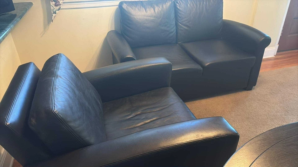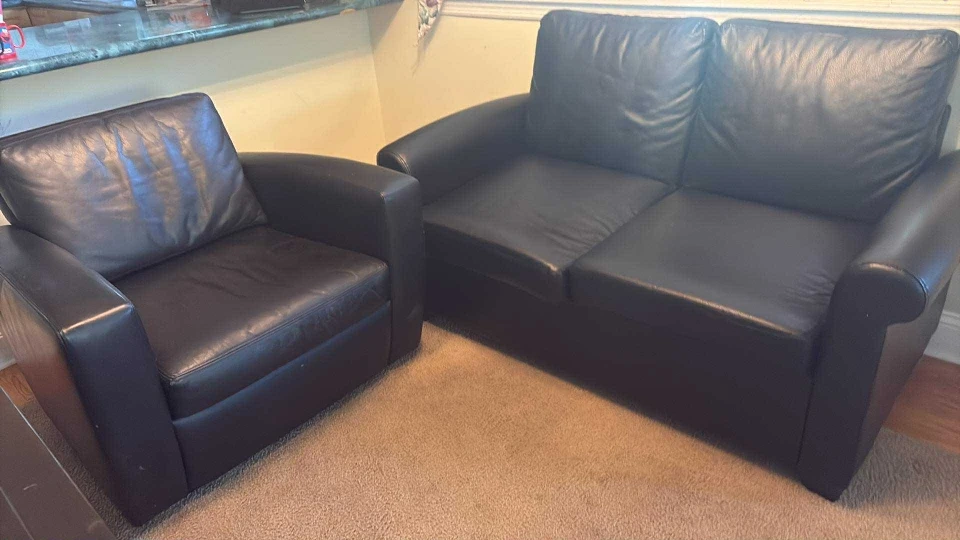 Selling a black leather loveseat and armchair set. They're in good condition and ready for a new living room! The set is comfortable and stylish, perfect for a cozy space. The leather has some signs of wear, but still looks great. Feel free to reach out if you're interested!