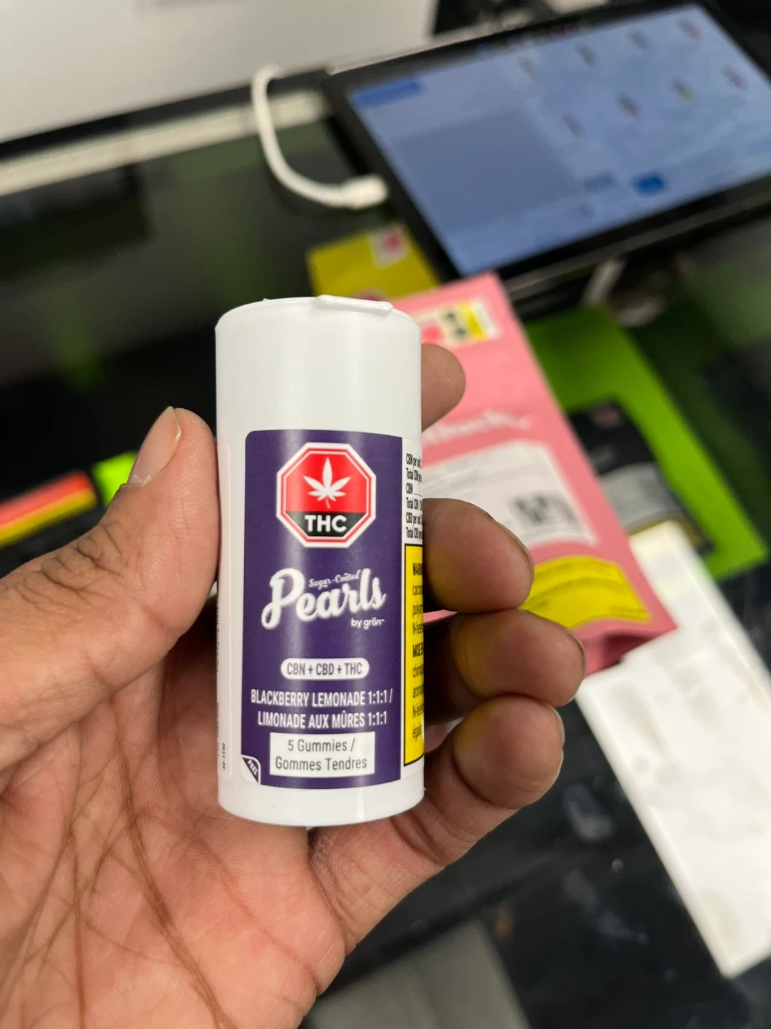 Selling a container of Grön Sugar-Coated Pearls. These are Blackberry Lemonade flavoured gummies with a 1:1:1 ratio of CBN, CBD, and THC. There are 5 gummies in the container