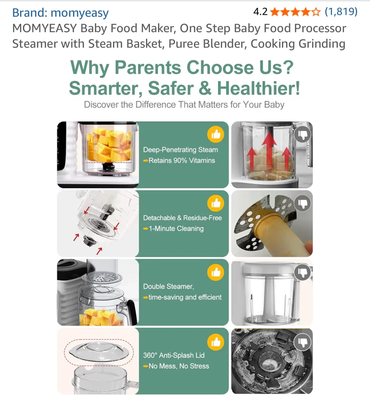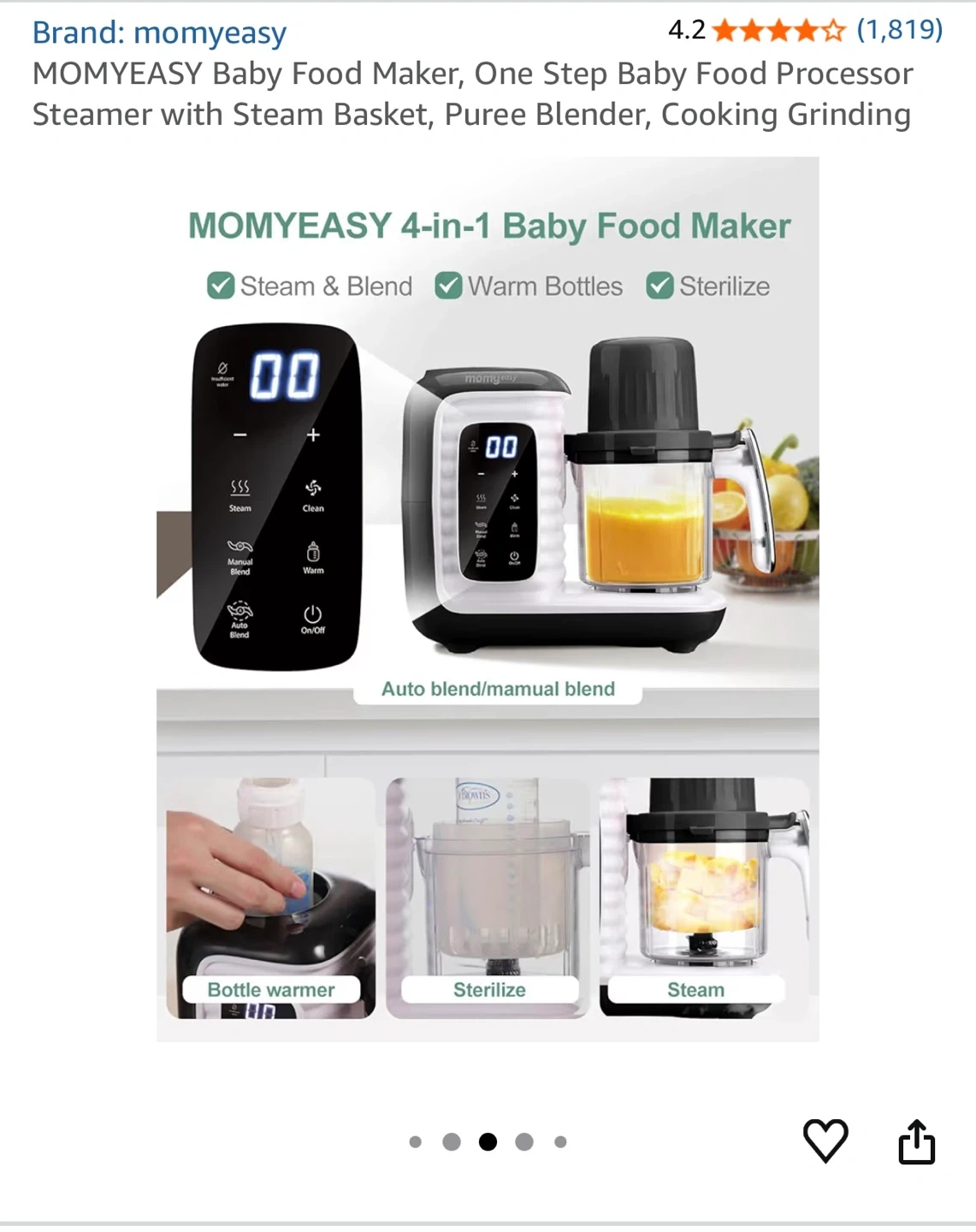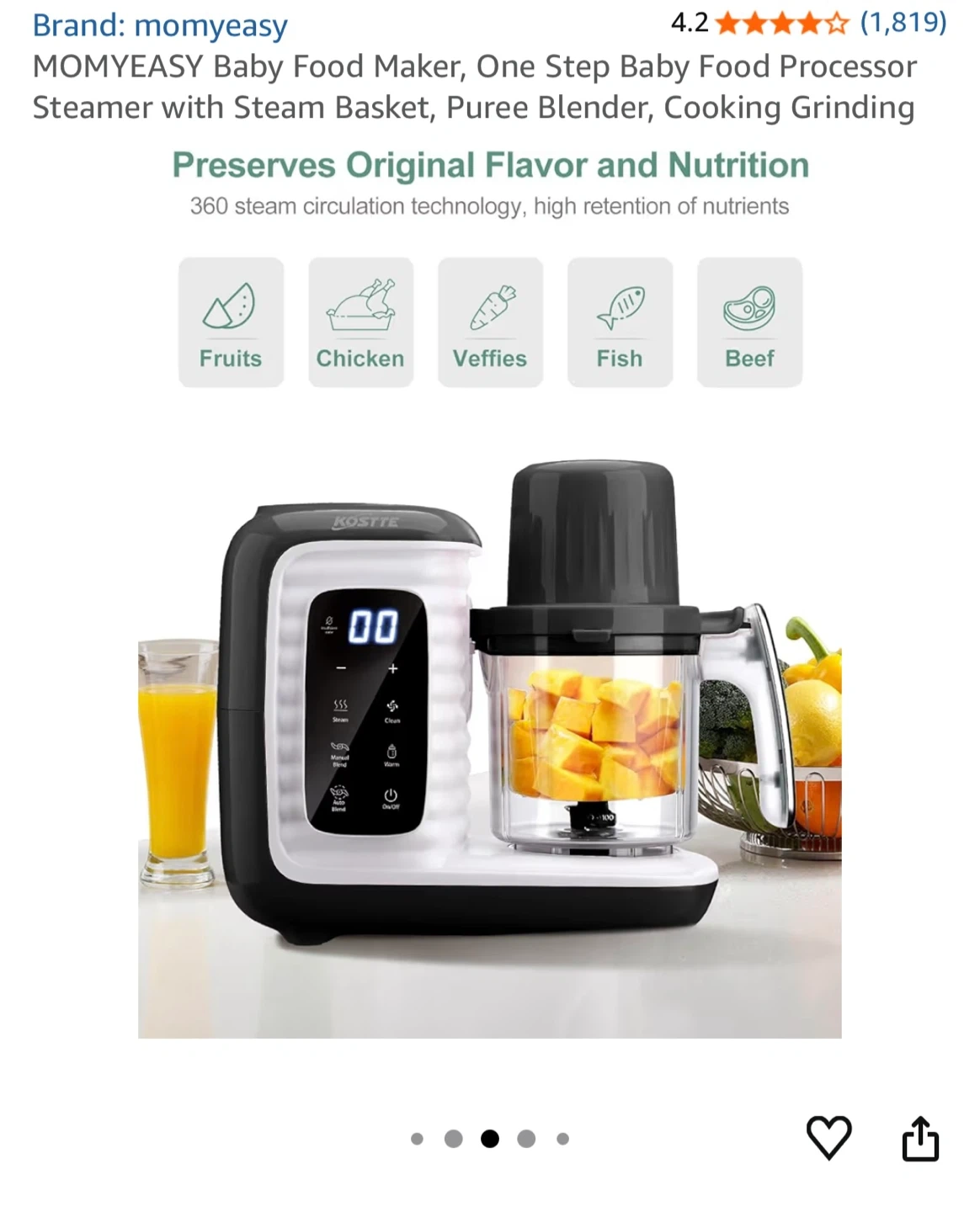 Selling a MOMYEASY baby food maker! It's a one-step food processor that can steam, blend, puree, and cook. It's designed to be smarter, safer, and healthier for your baby. You can choose automatic or manual control to give your baby the perfect meal. It also warms bottles and sterilizes!
