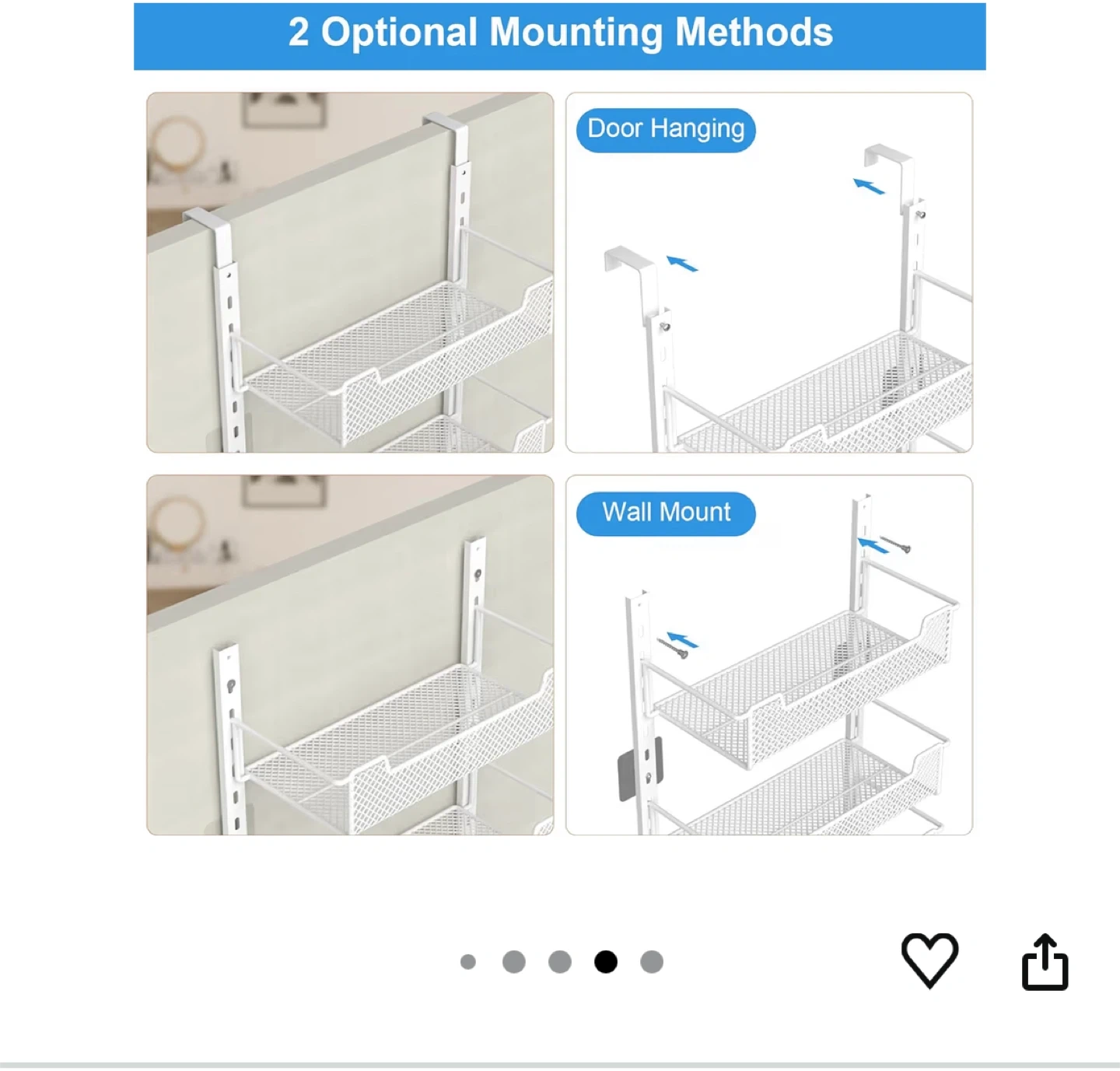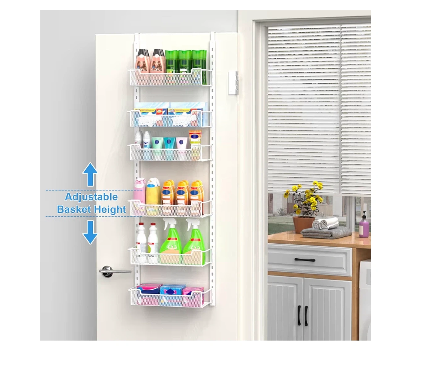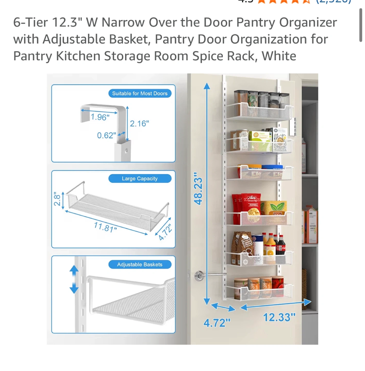 I'm selling a 6-tier over-the-door pantry organizer in white. It's a narrow design, perfect for pantry kitchen storage or spice rack organization. It comes with adjustable baskets and can be mounted over the door or on the wall. The dimensions are approximately 12.3" wide and 48.23" tall.