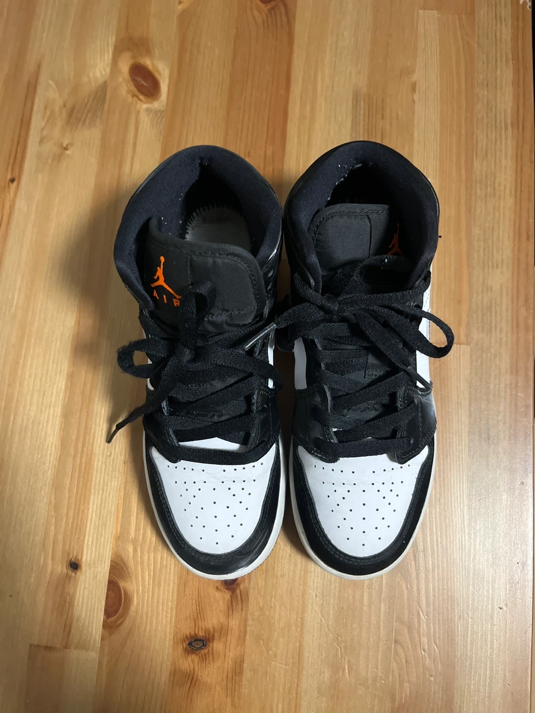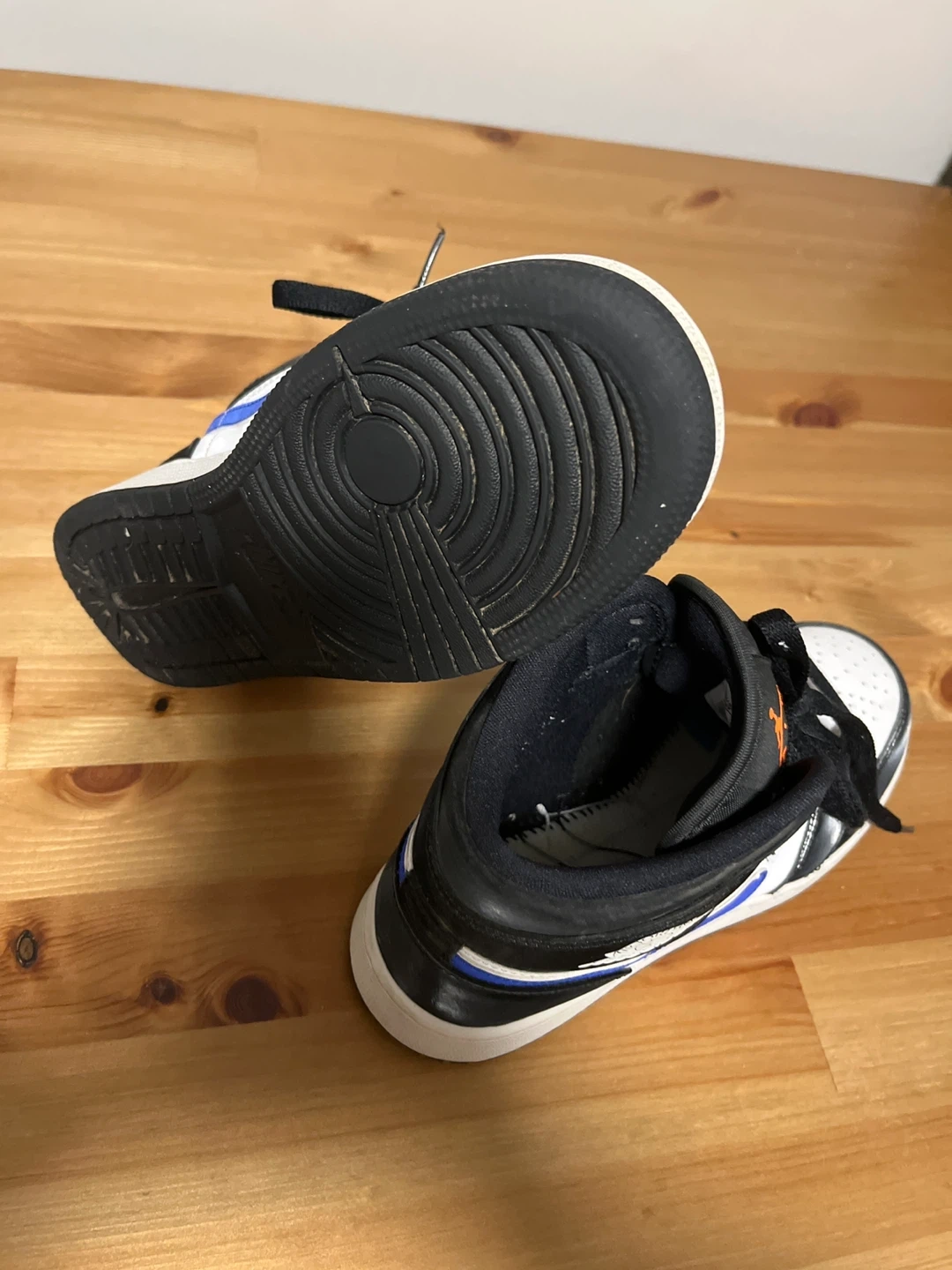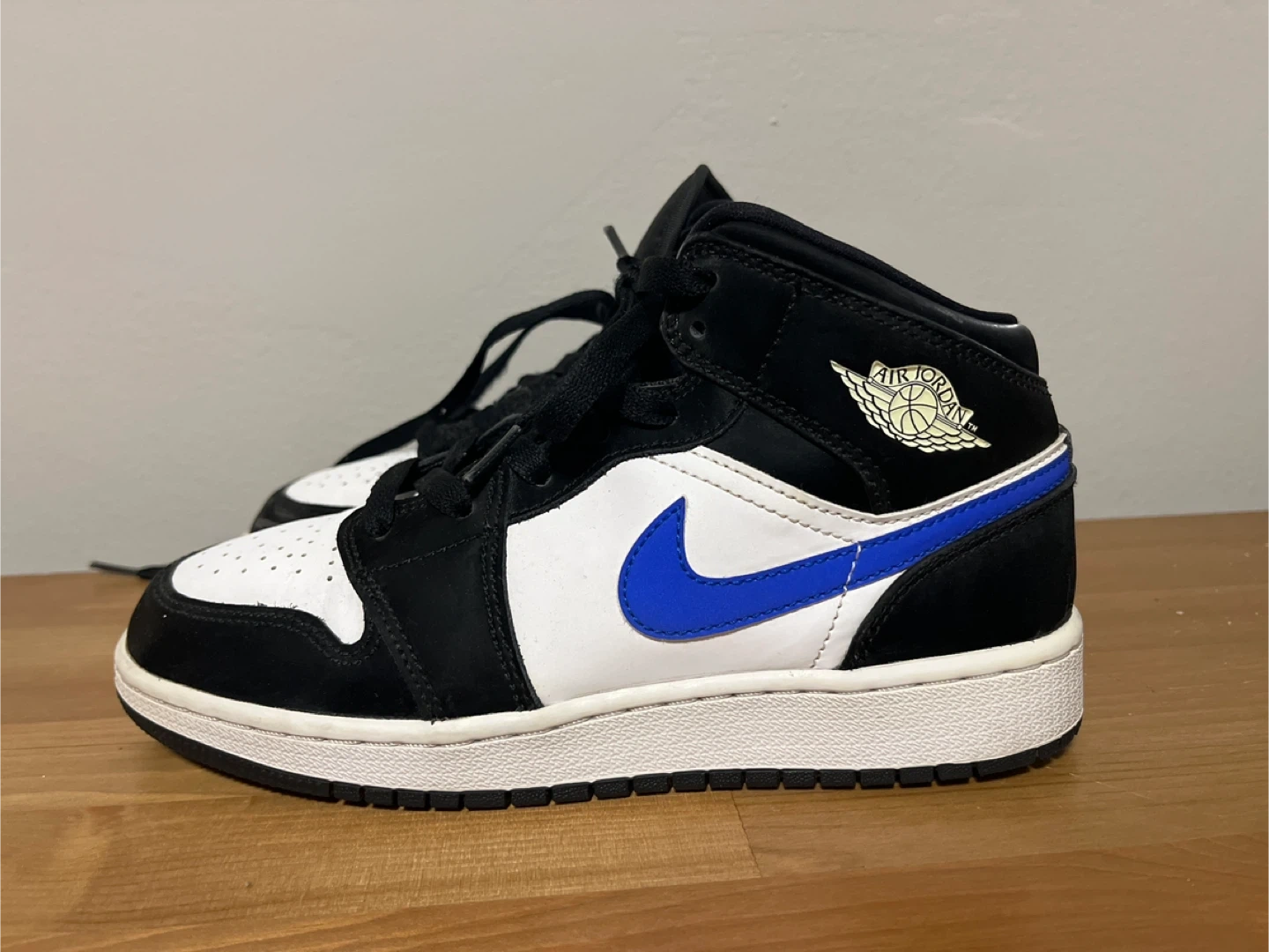 Selling a pair of Jordan Air 1 Mid sneakers in black, white, and blue. They are a youth size 5.5. Great for everyday wear!LIKE NEW!!(They were only worn twice!)