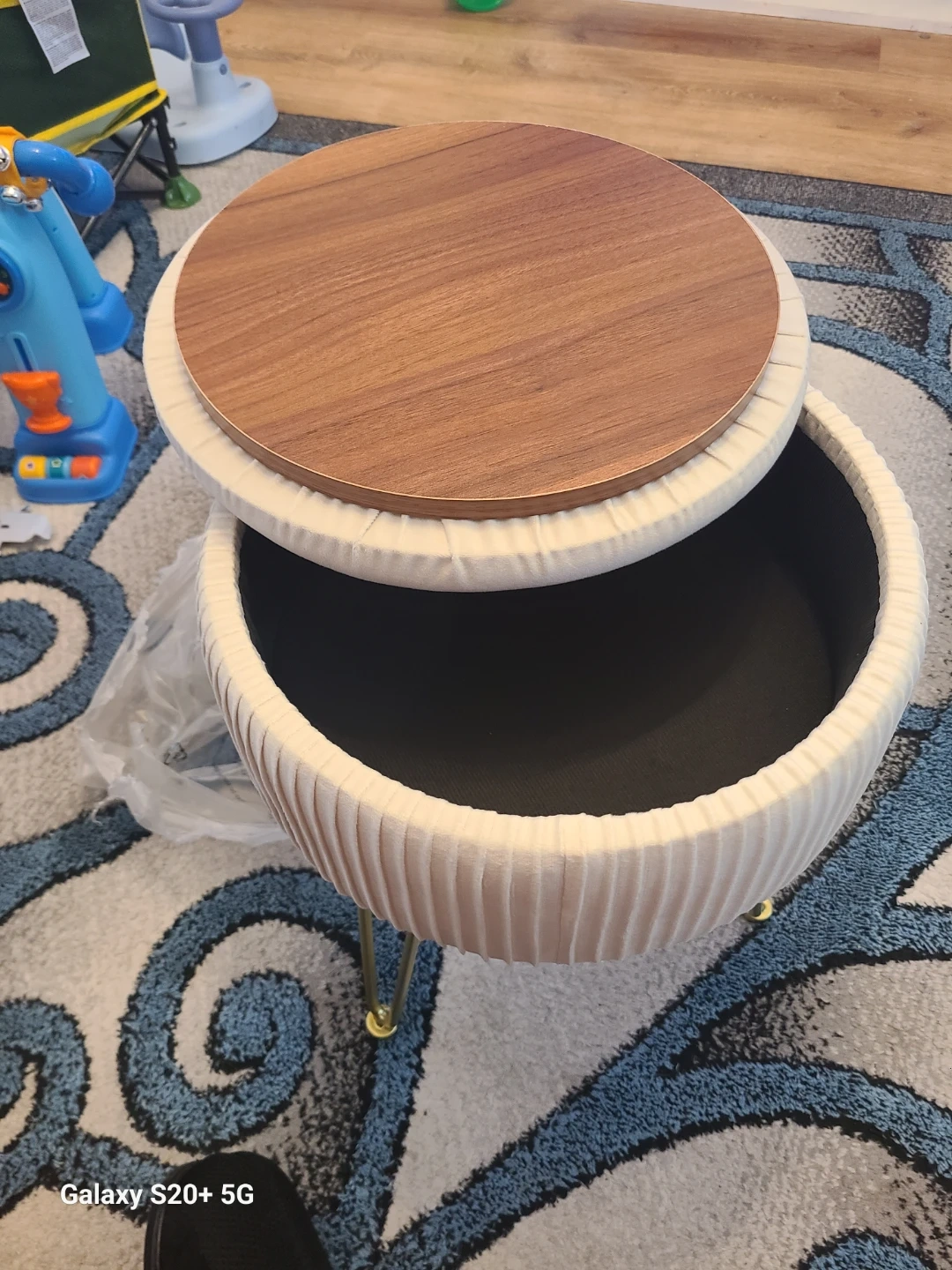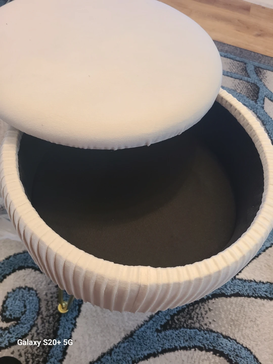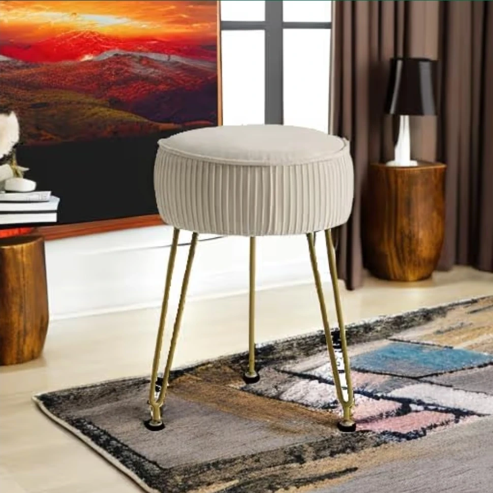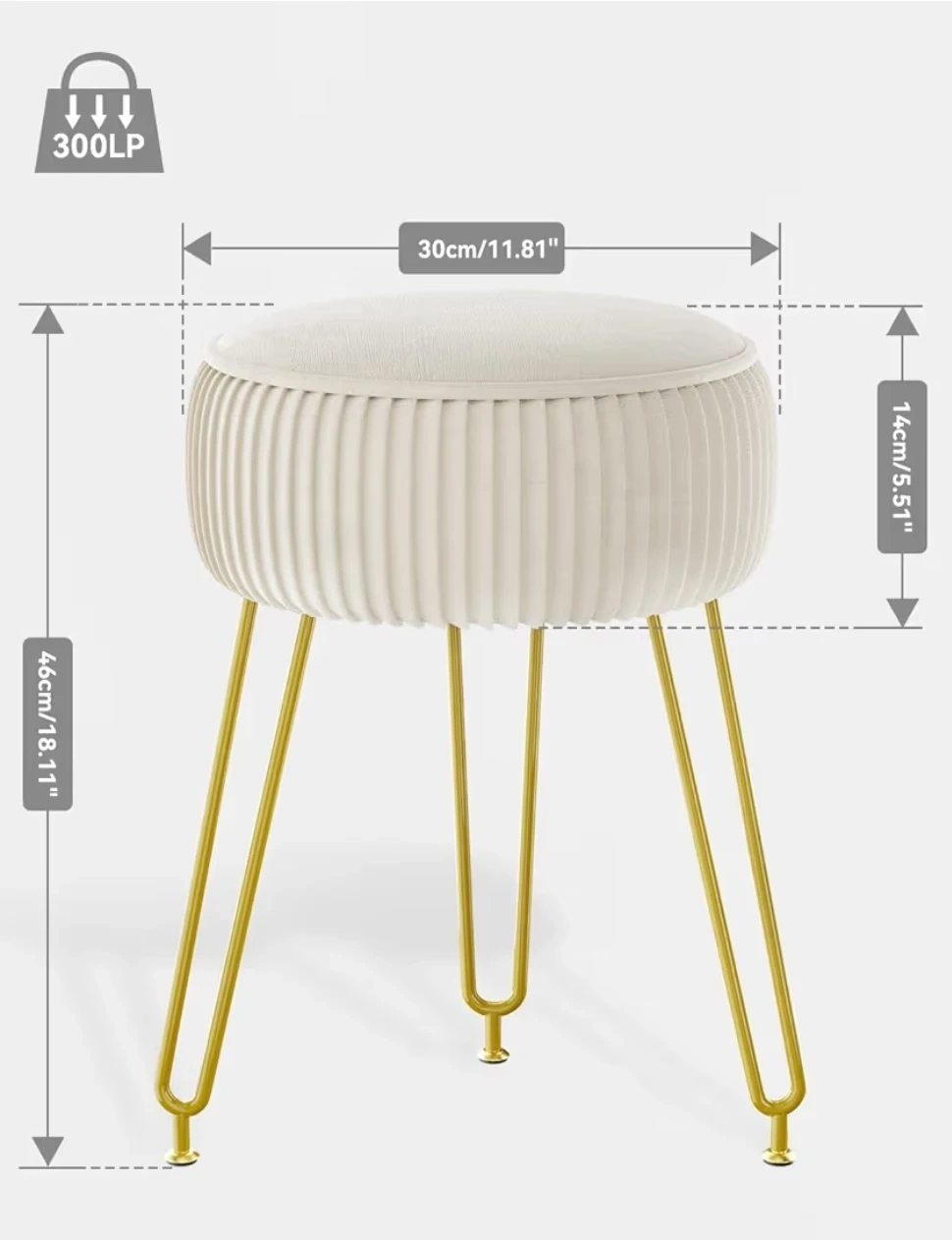 This is a vanity stool, storage ottoman . It's cream colored with gold colored legs. It measures approximately 11.81 inches in diameter and is about 18.11 inches tall. It can hold up to 300 lbs