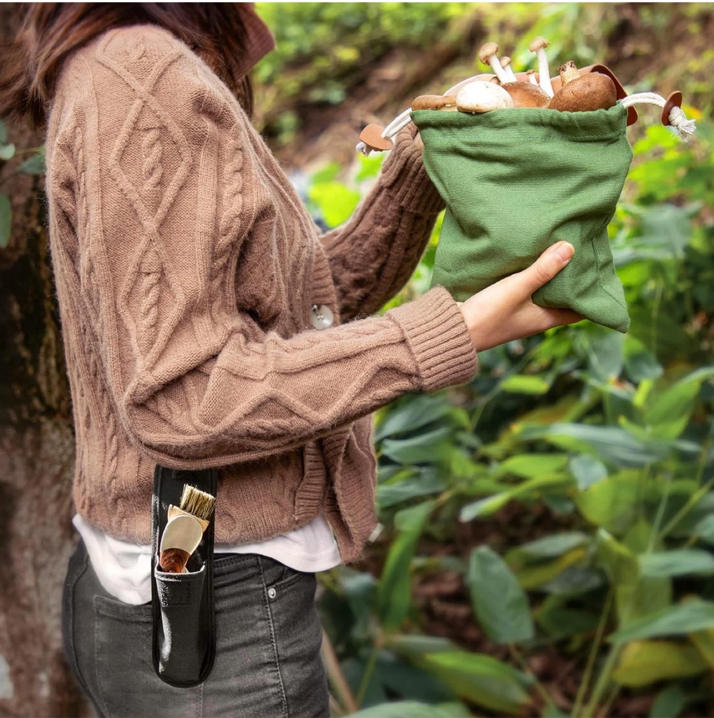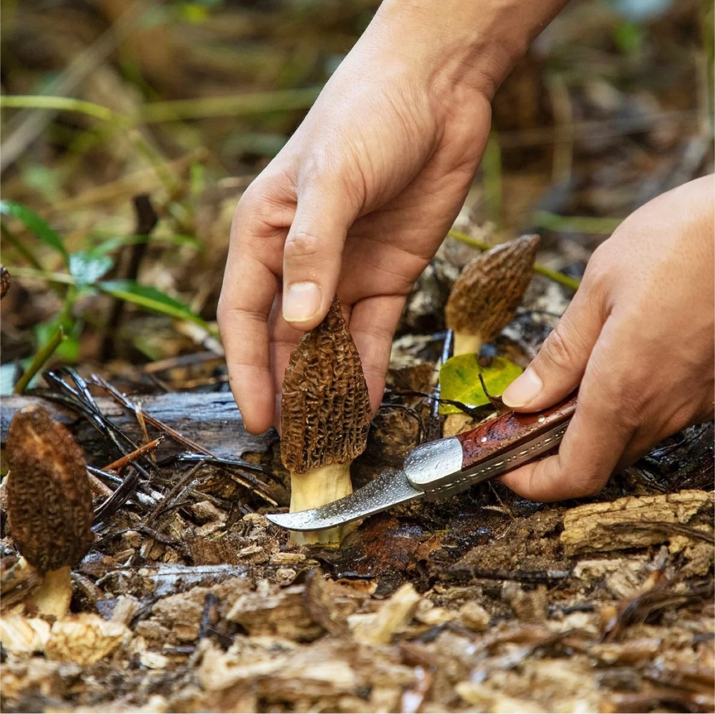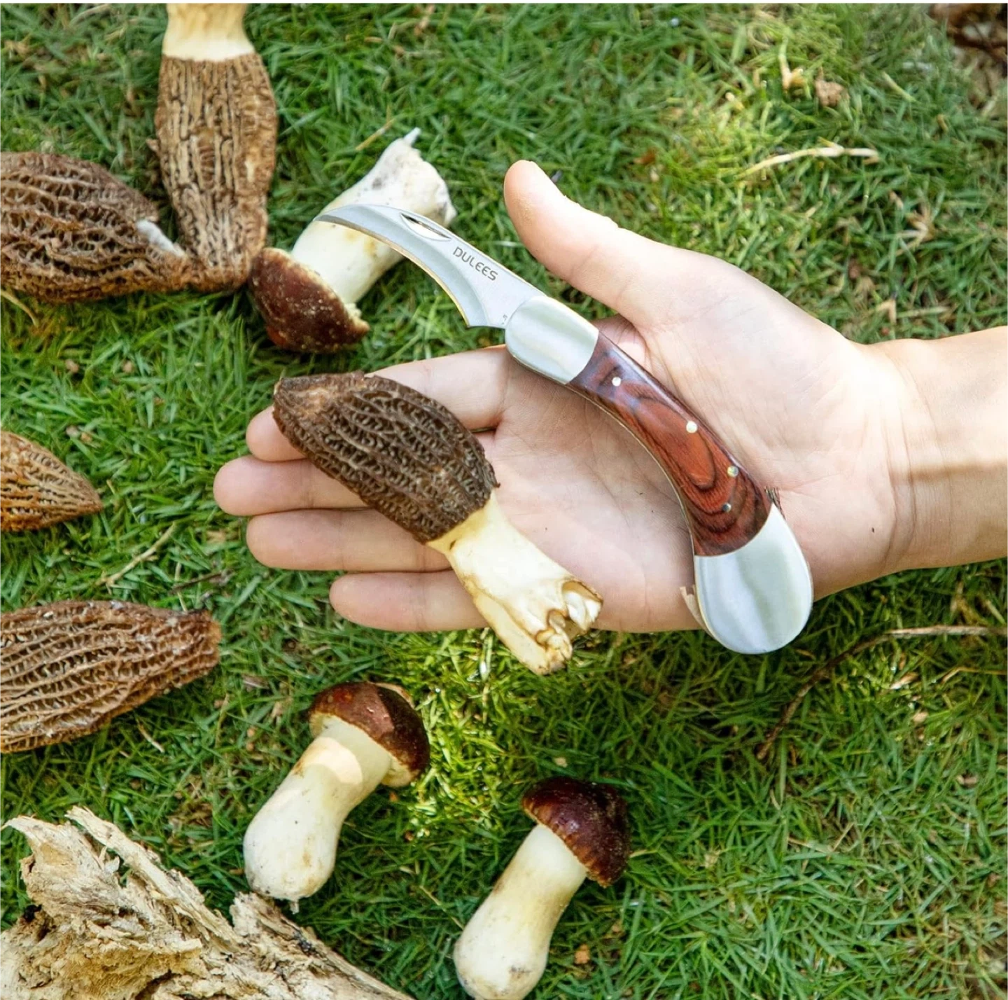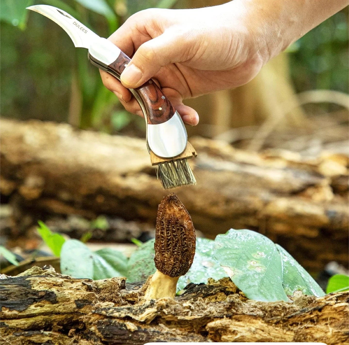 Selling a DULCES mushroom knife. It has a curved blade and a small brush, perfect for foraging. The handle has a wood grain look.