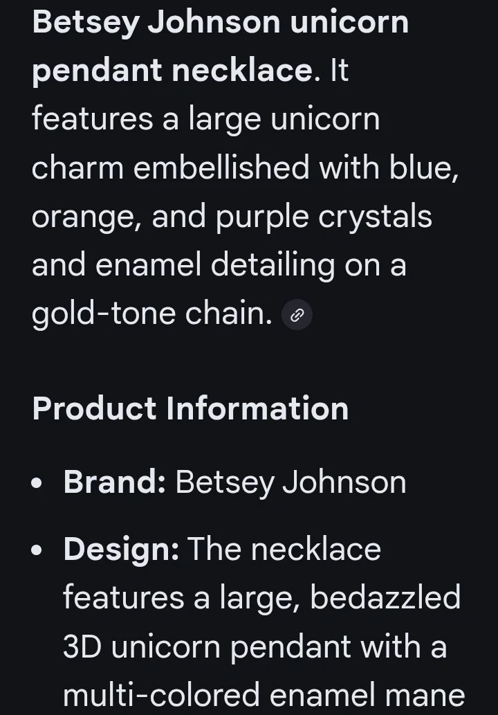 This Betsey Johnson necklace features a large, bedazzled 3D unicorn pendant with a multi-coloured enamel mane. The unicorn charm is embellished with blue, orange, and purple Gem crystals and enamel detailing on a gold-tone chain. It's a real statement piece!
