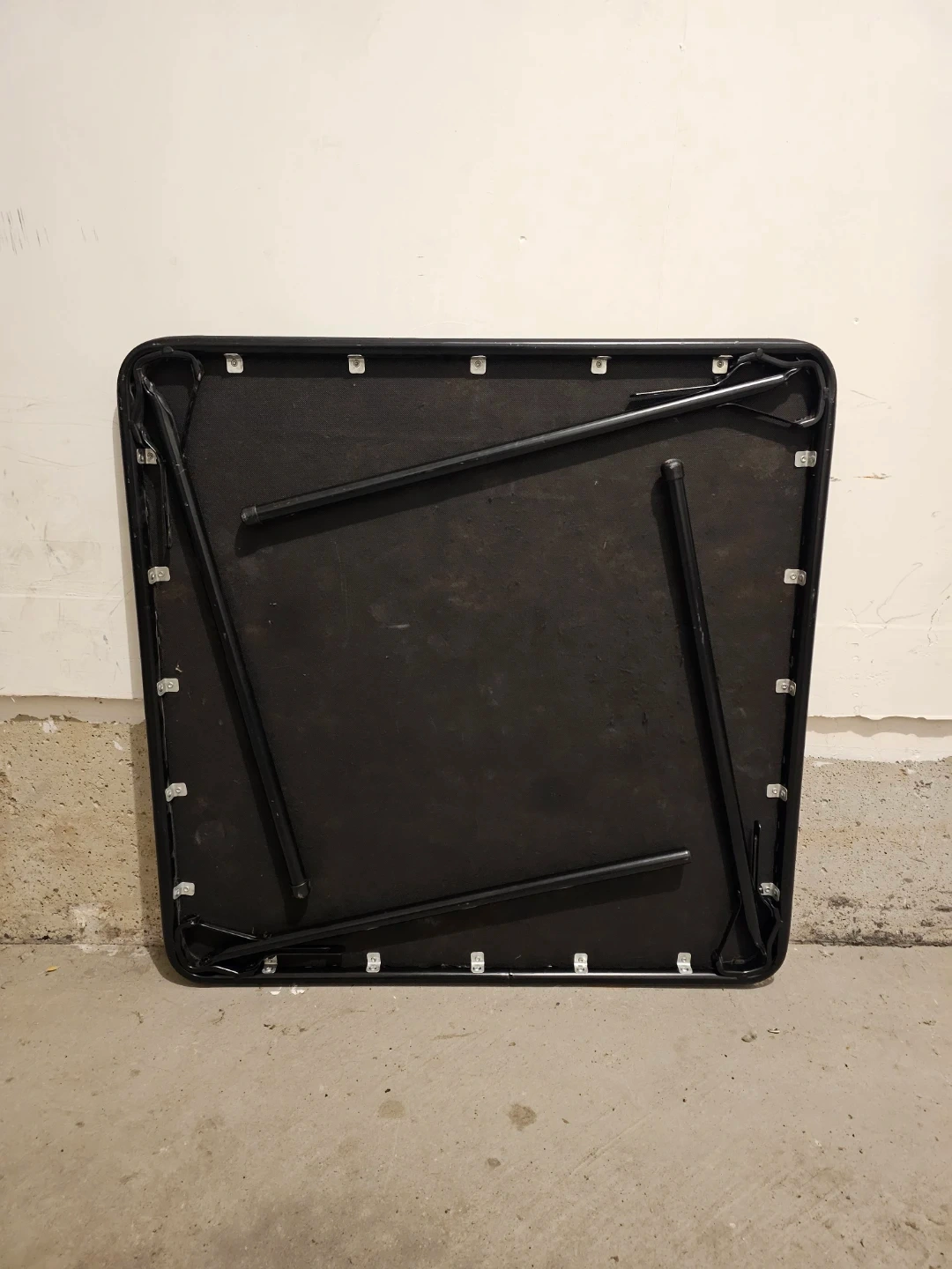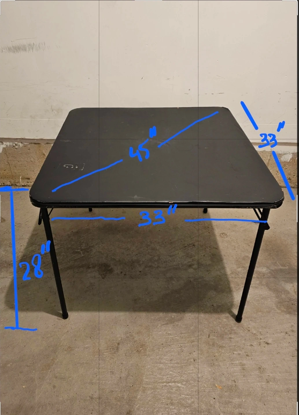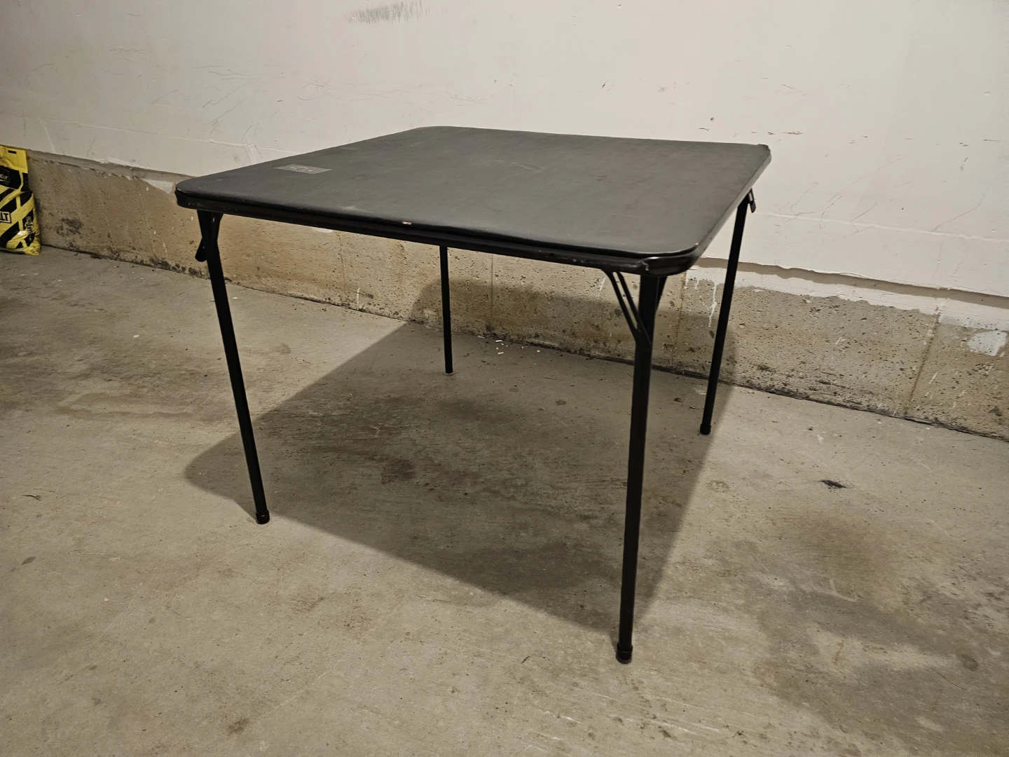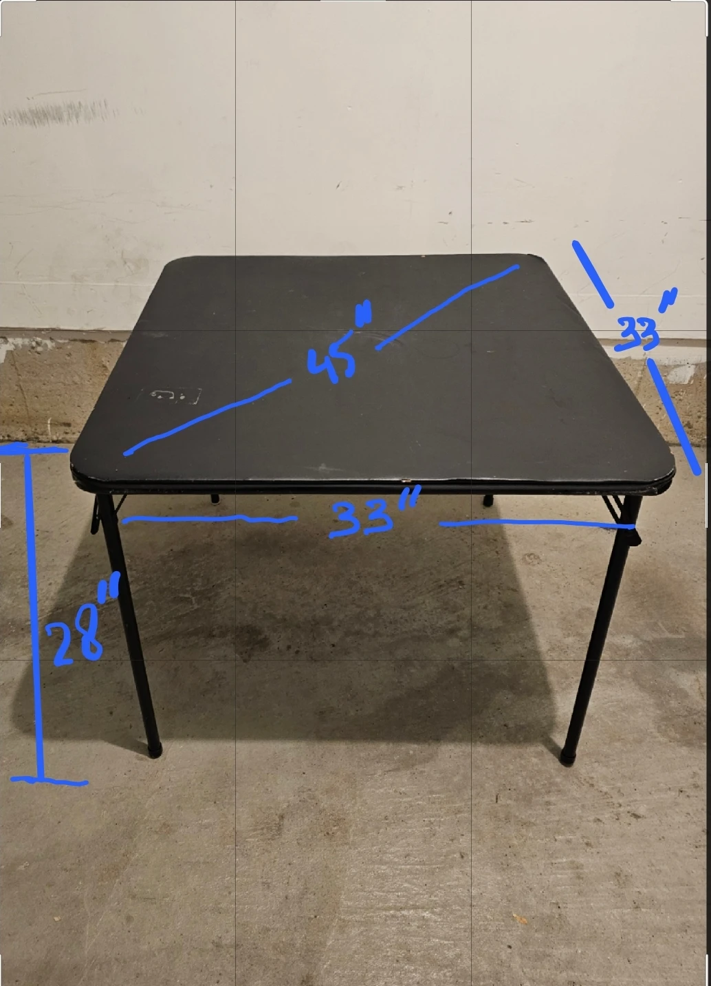 Selling a folding table in black. It's quite handy and easy to store since the legs fold up. Normal wear n tear.