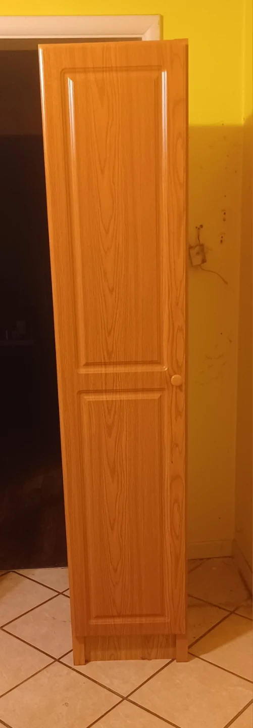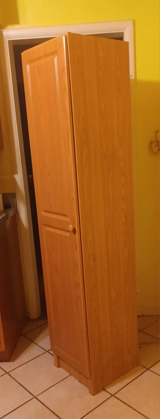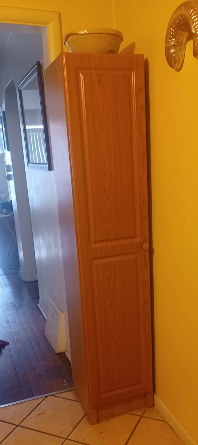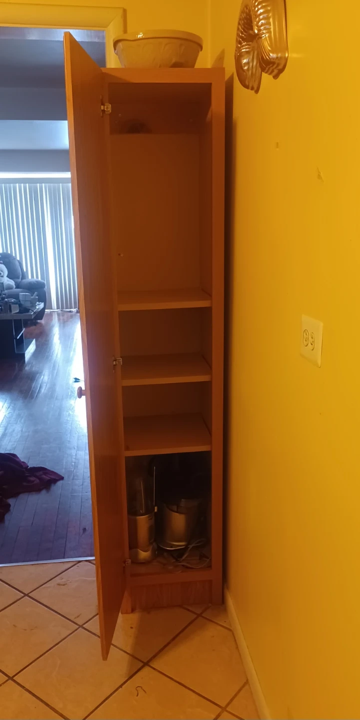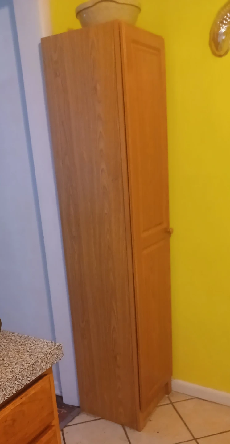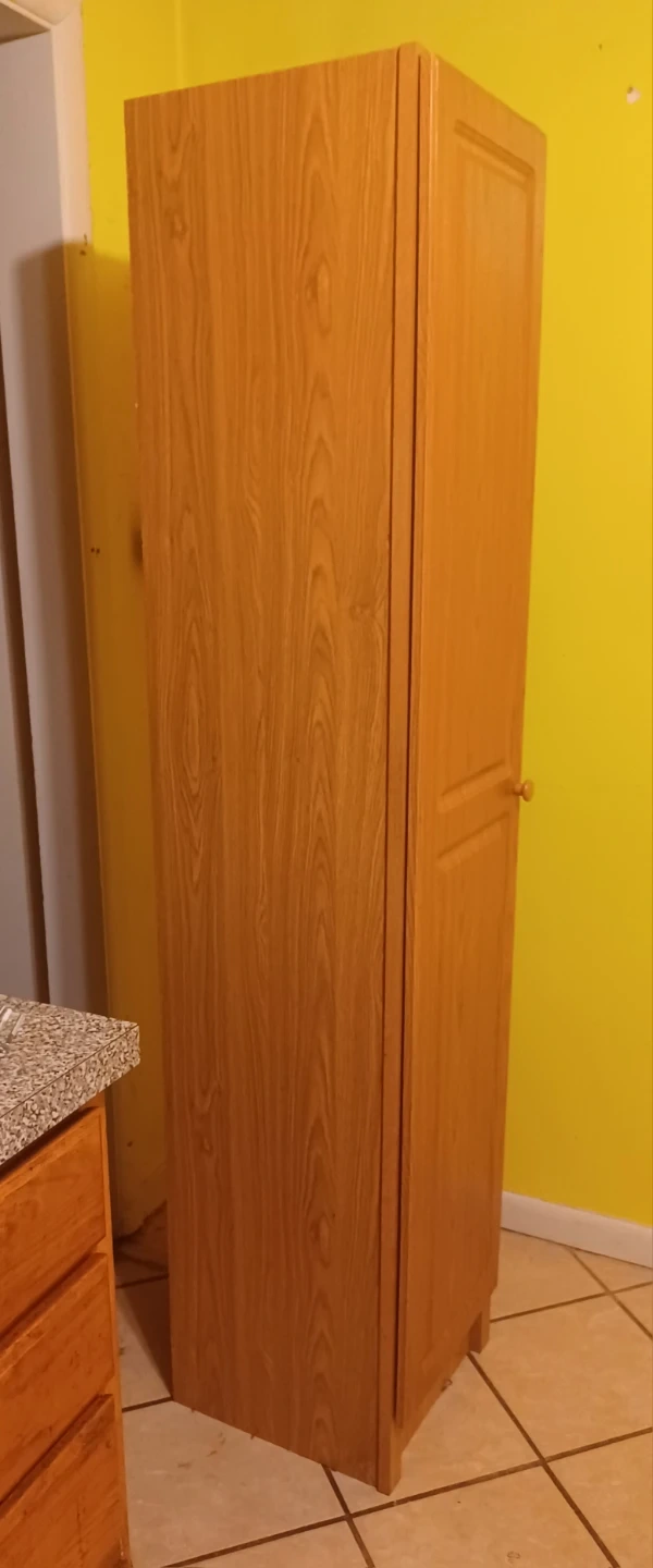 I'm selling a wooden storage cabinet. It's in good condition and offers ample space for your storage needs. It has multiple shelves for organization. Perfect for any room in your home!