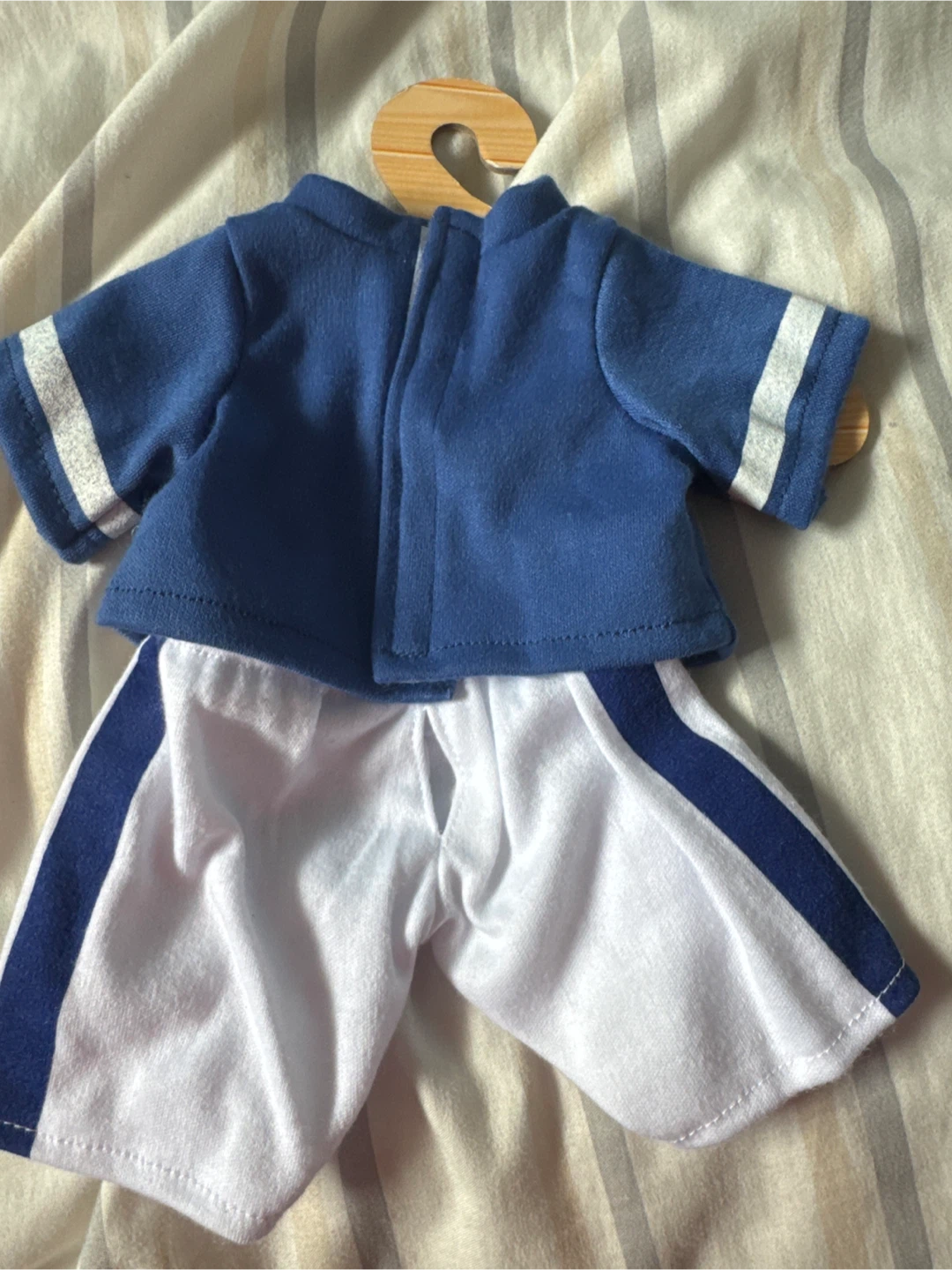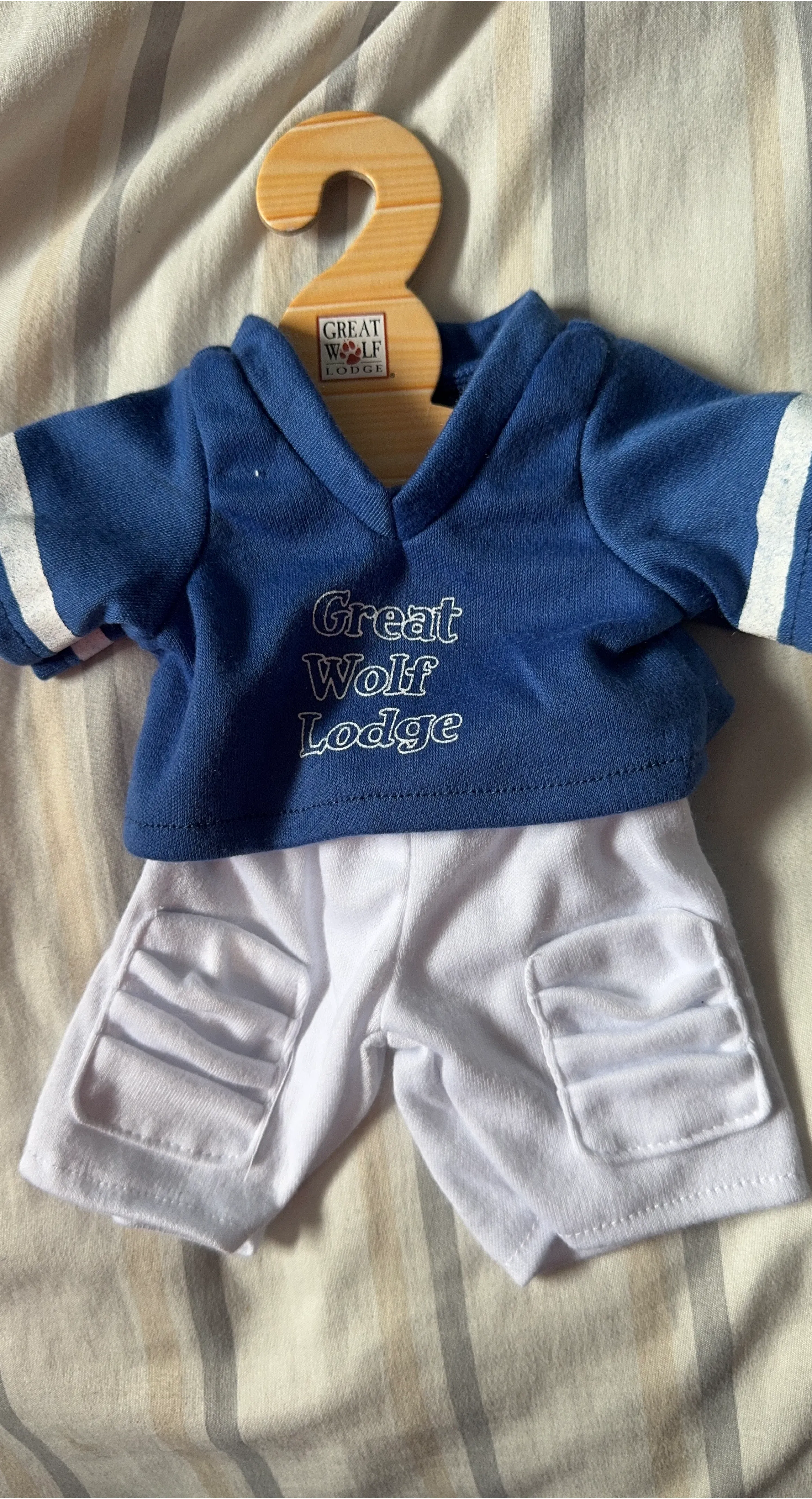 This is a cute Great Wolf Lodge outfit for a stuffed animal. It features a blue top with the Great Wolf Lodge logo and white shorts. Perfect for dressing up your favorite plush toy!