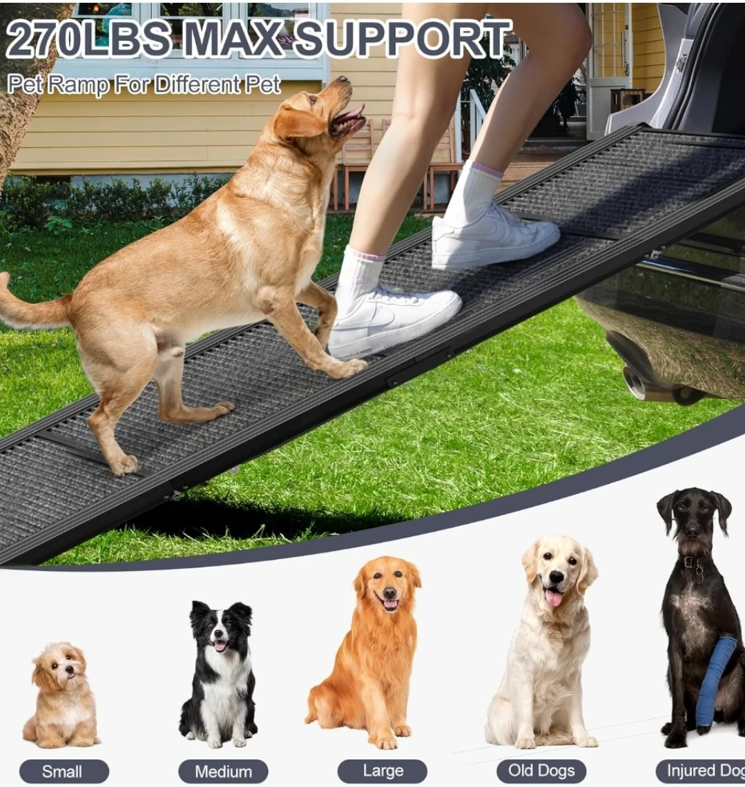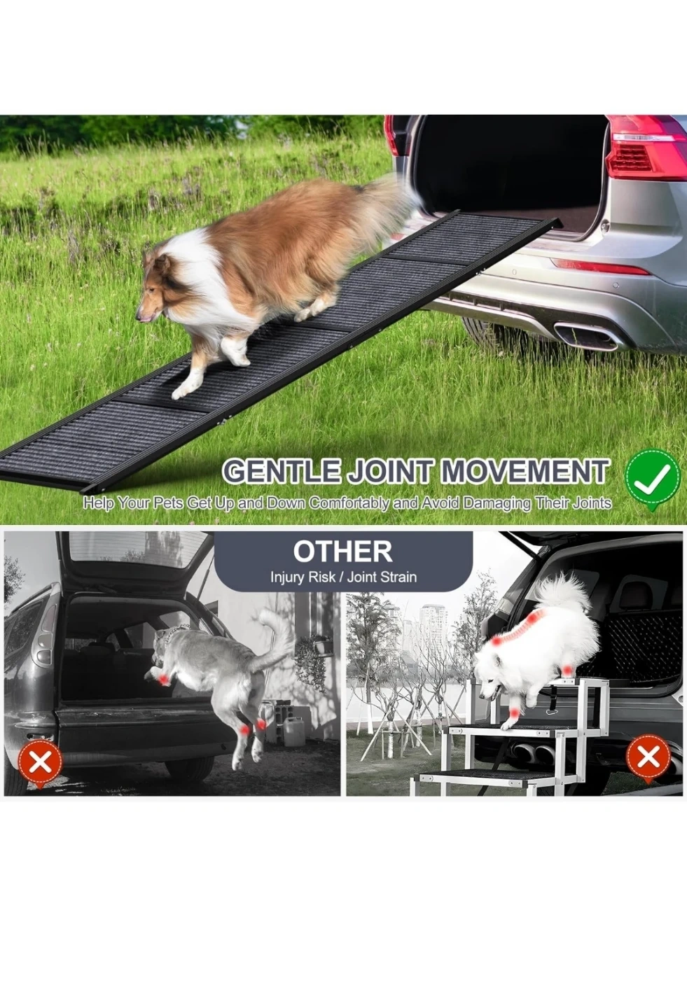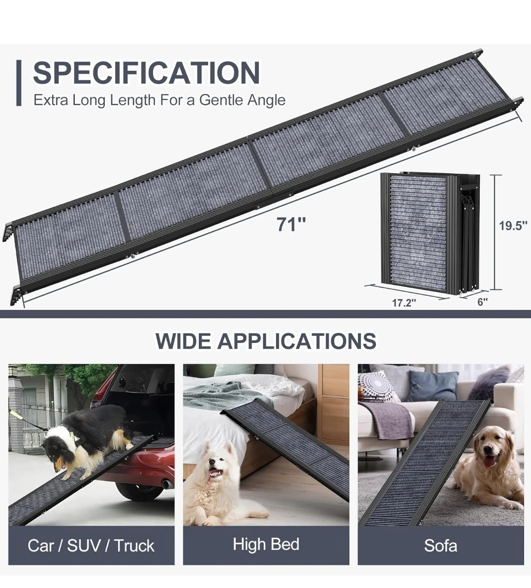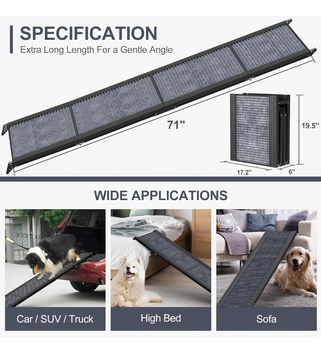 This foldable pet ramp is perfect for helping your furry friends get in and out of cars, SUVs, trucks, or even up onto high beds and sofas. It's designed with gentle joint movement in mind, helping your pets get up and down comfortably and avoid damaging their joints. The ramp is extra long for a gentle angle and supports up to 270lbs. It's also foldable and portable, making it easy to transport and store