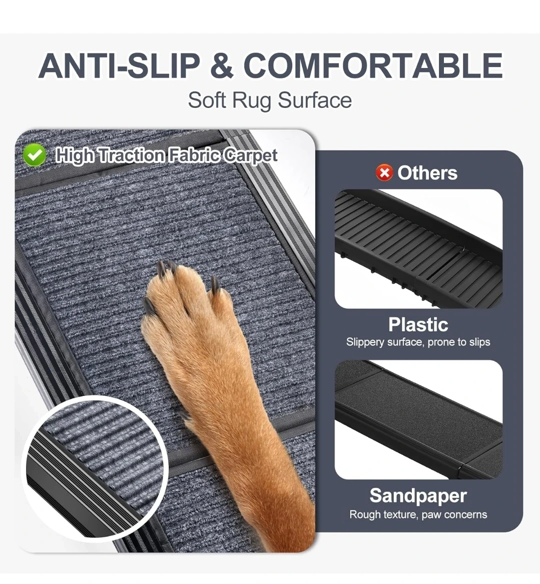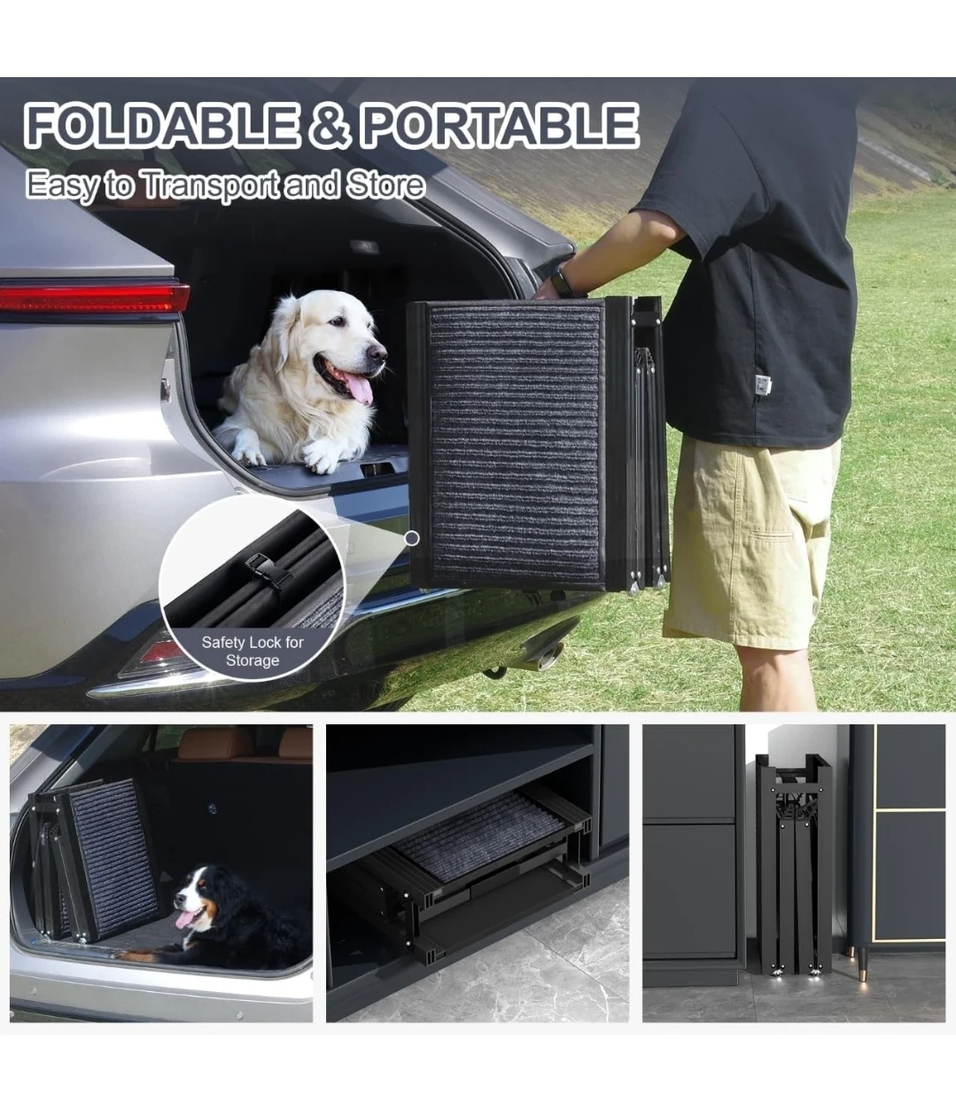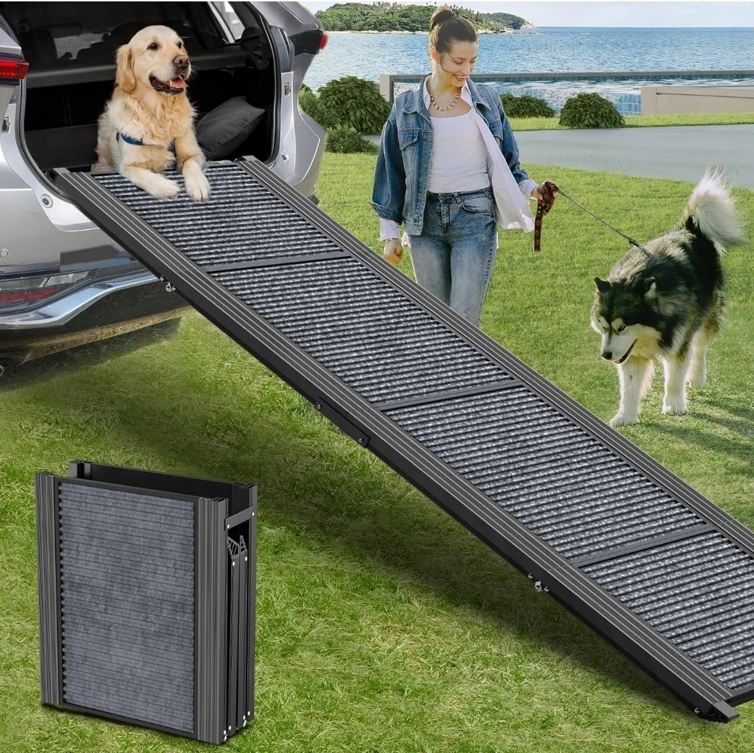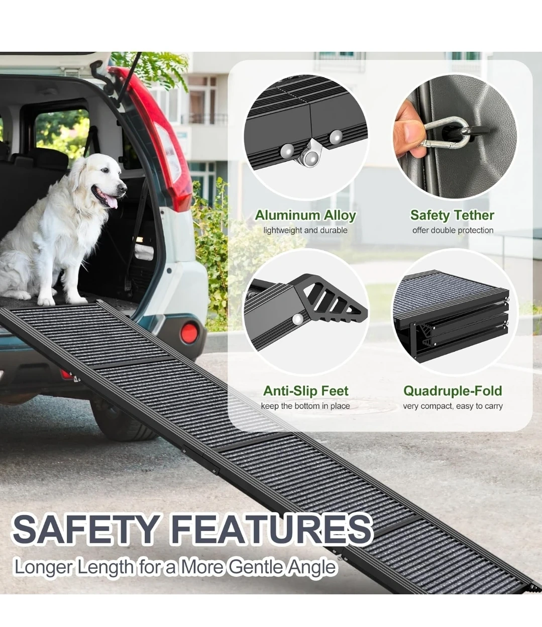 This foldable pet ramp is perfect for helping your furry friends get in and out of cars, SUVs, trucks, or even up onto high beds and sofas. It's designed with gentle joint movement in mind, helping your pets get up and down comfortably and avoid damaging their joints. The ramp is extra long for a gentle angle and supports up to 270lbs. It's also foldable and portable, making it easy to transport and store