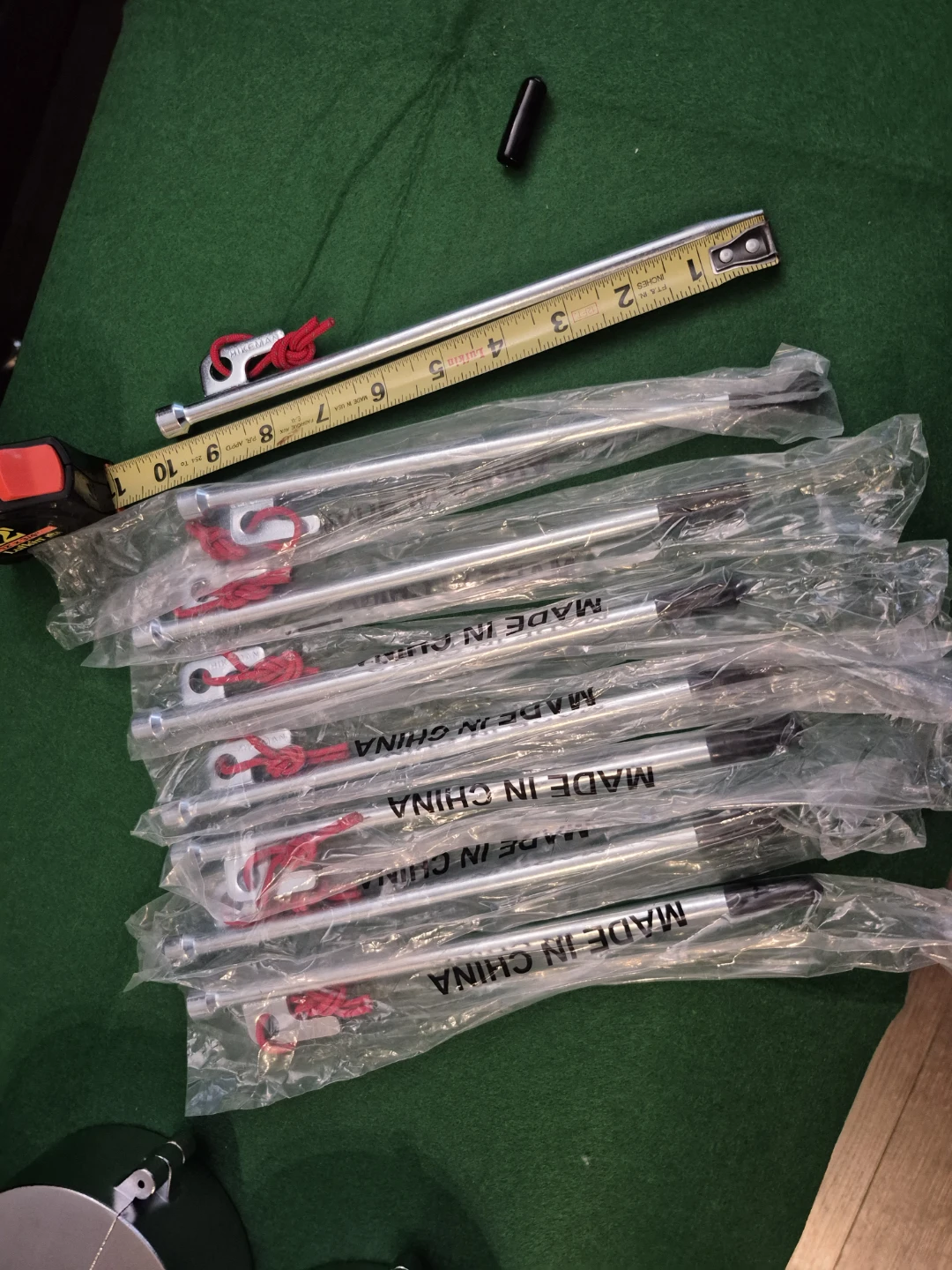 I'm selling a set of 8 Hikeman solid steel tent stakes, still in their original packaging. They are made in China. A tape measure in the photo shows the poles are approximately 10 inches long. Perfect for camping! Super heavy duty!