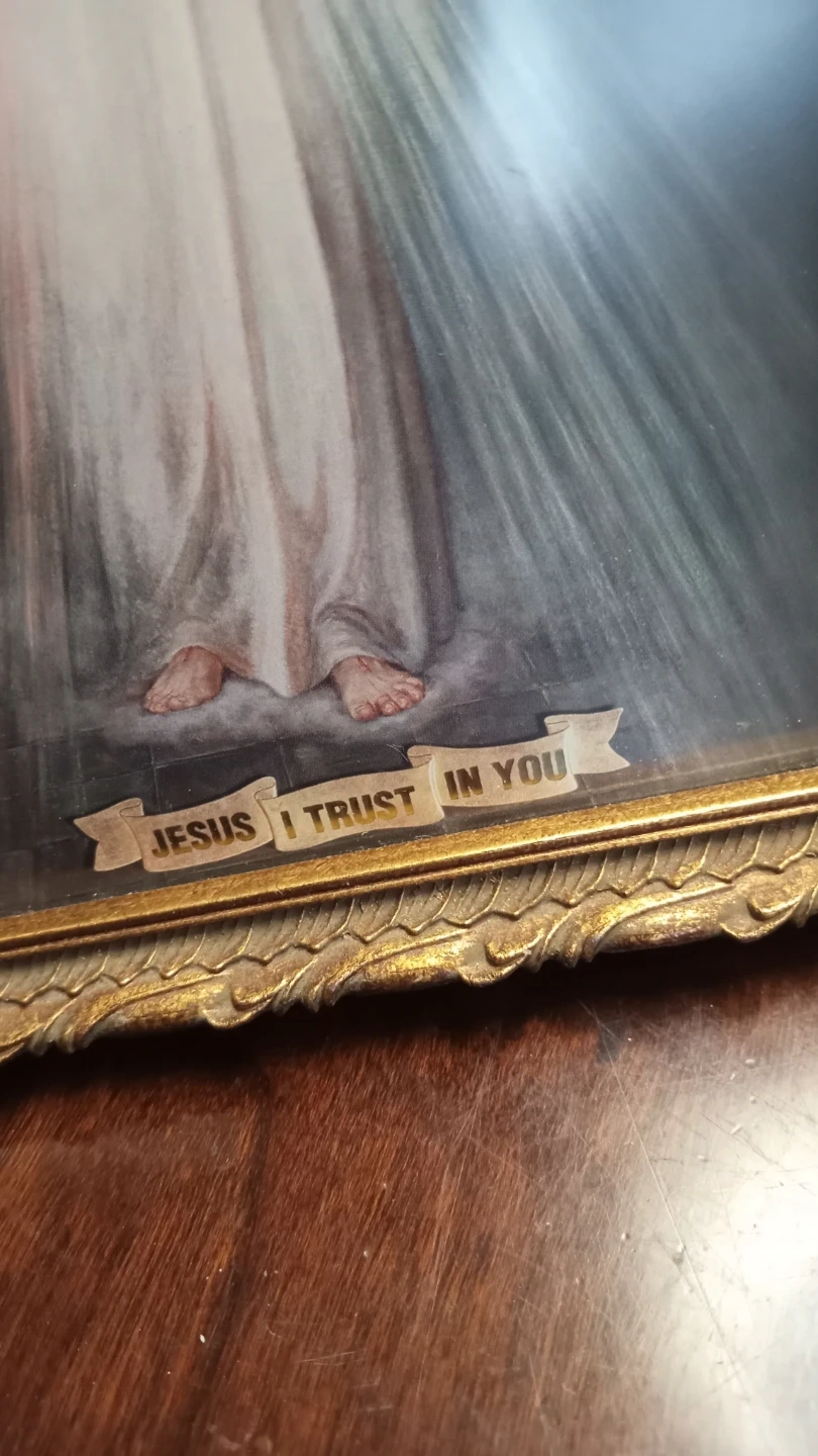 A framed picture with the inscription "Jesus I Trust In You" is up for grabs. It's in good condition and would look great in any home