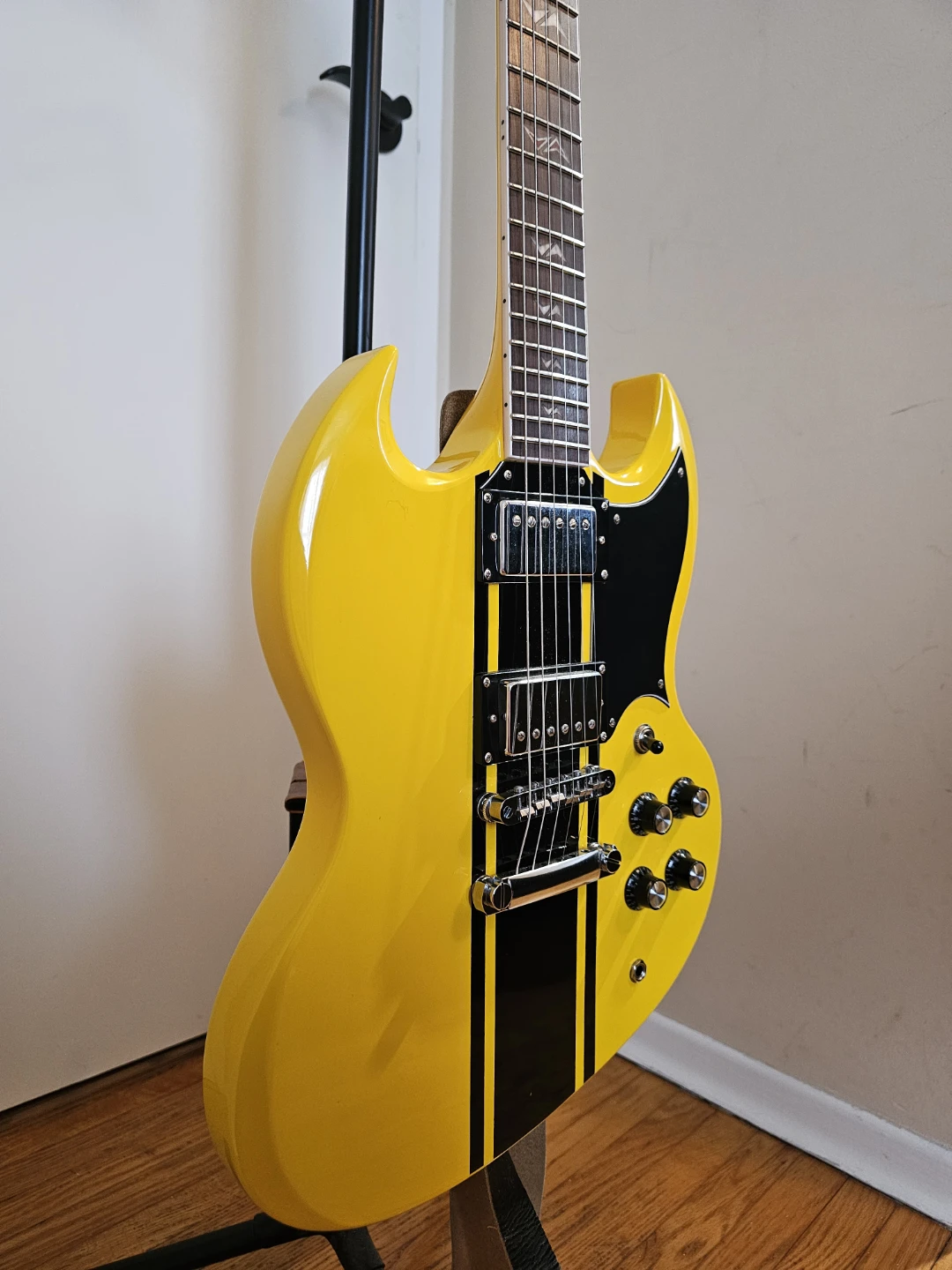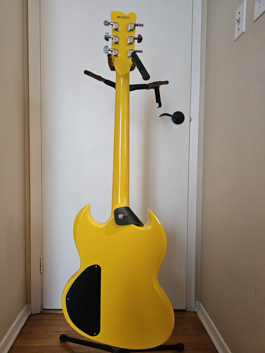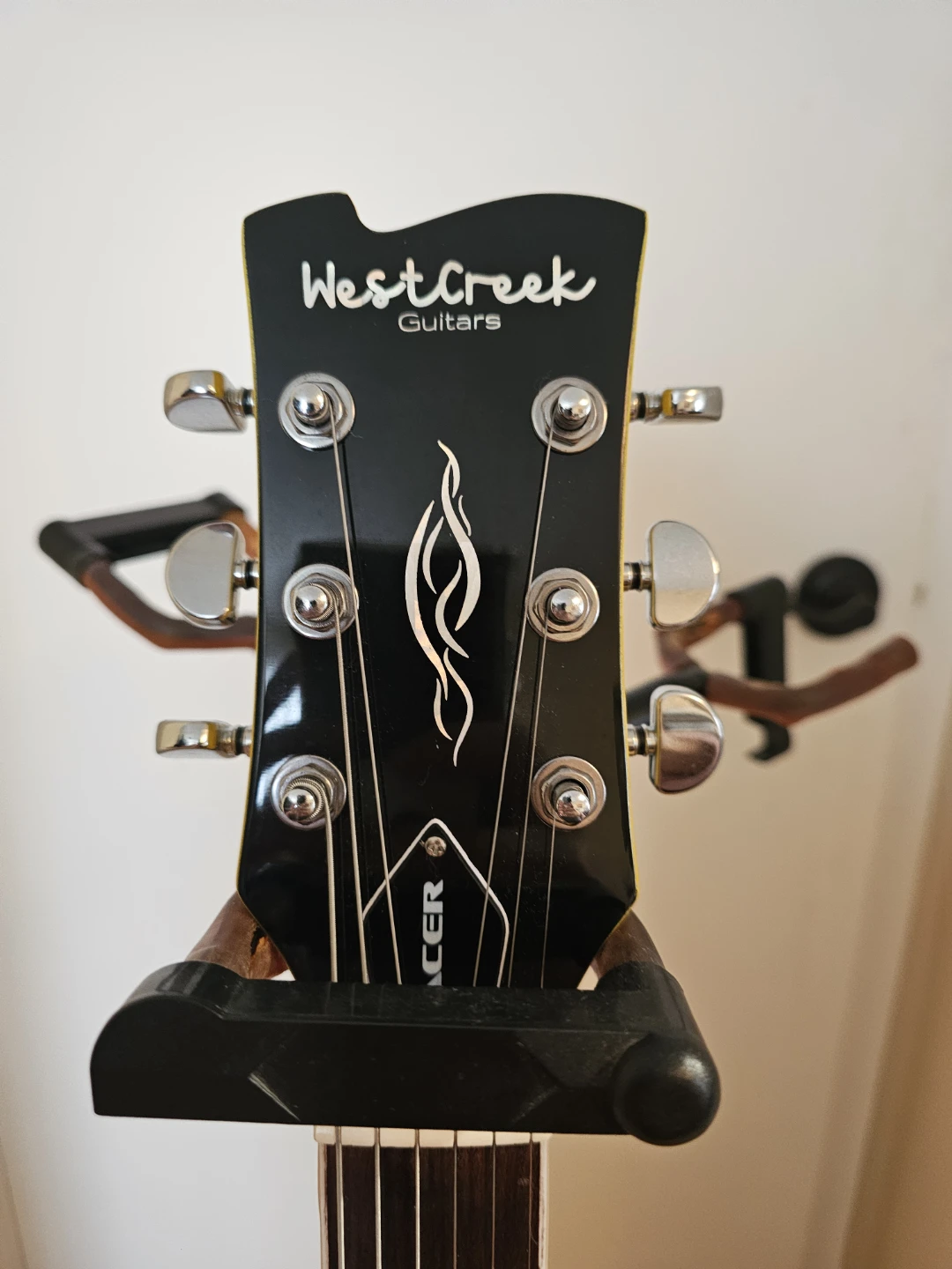 Selling a WestCreek Guitars electric guitar in a vibrant yellow colour. It's in great shape and ready for a new player to enjoy. Perfect for someone looking for a unique and stylish instrument!