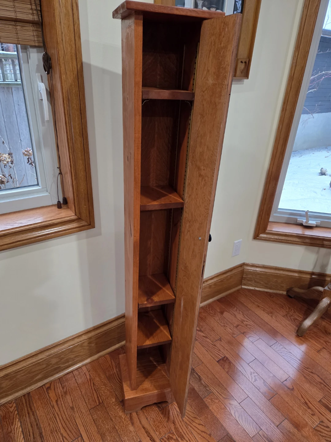 Here's a lovely wooden display cabinet in great condition. It has multiple shelves inside, perfect for showcasing your favourite items. It features a unique design on the door.