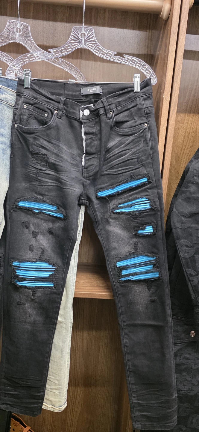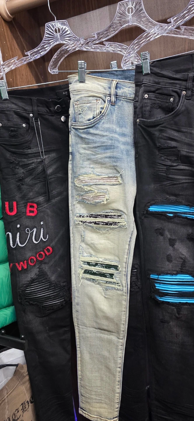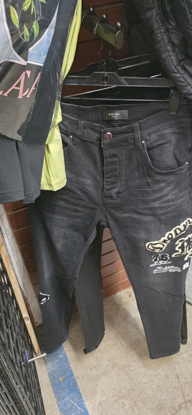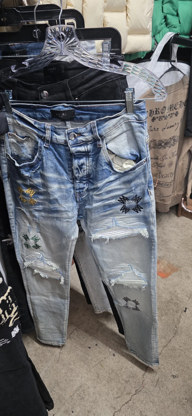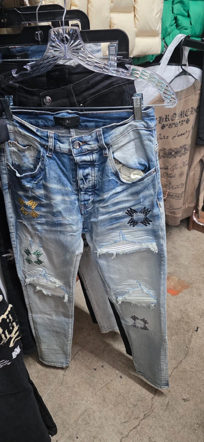 Selling a pair of Amiri distressed denim jeans. These jeans feature a unique design with various distressed details and stylish embellishments. They are in good condition and perfect for adding an edgy touch to your wardrobe. Feel free to reach out if you have any questions!