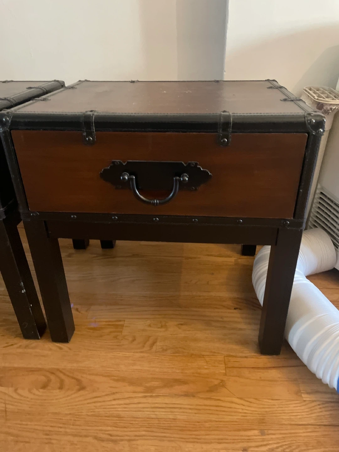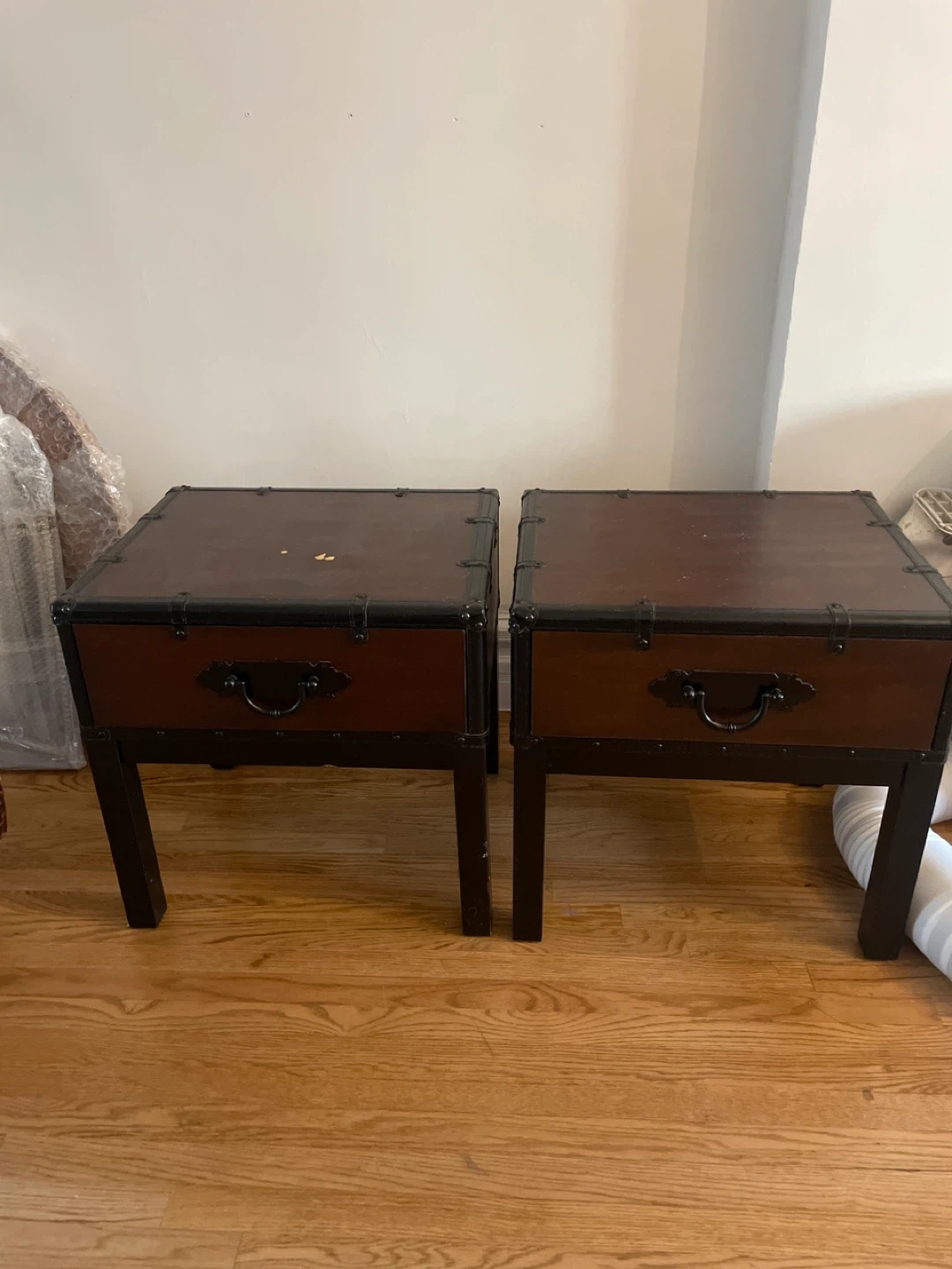 Selling a pair of wooden nightstands. They feature a dark brown finish with black metal accents, giving them a unique look. Perfect for adding a touch of style to your bedroom!