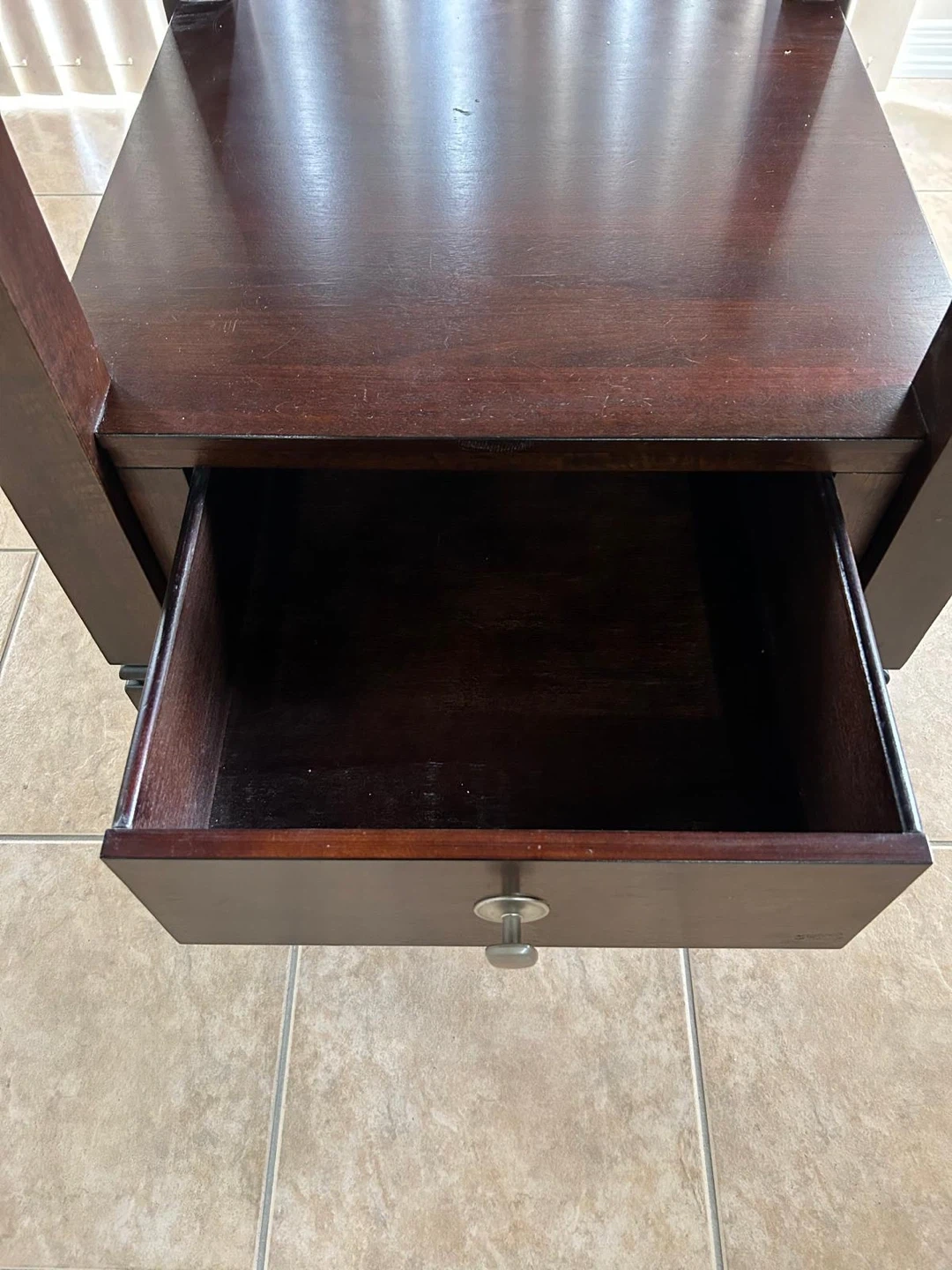 Selling a dark brown square end table with a black circular inset on top. The table also has a drawer for storage. Also included are three matching bar stools with padded seats. They're in great shape and ready for a new home!