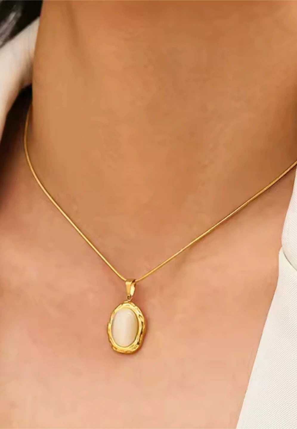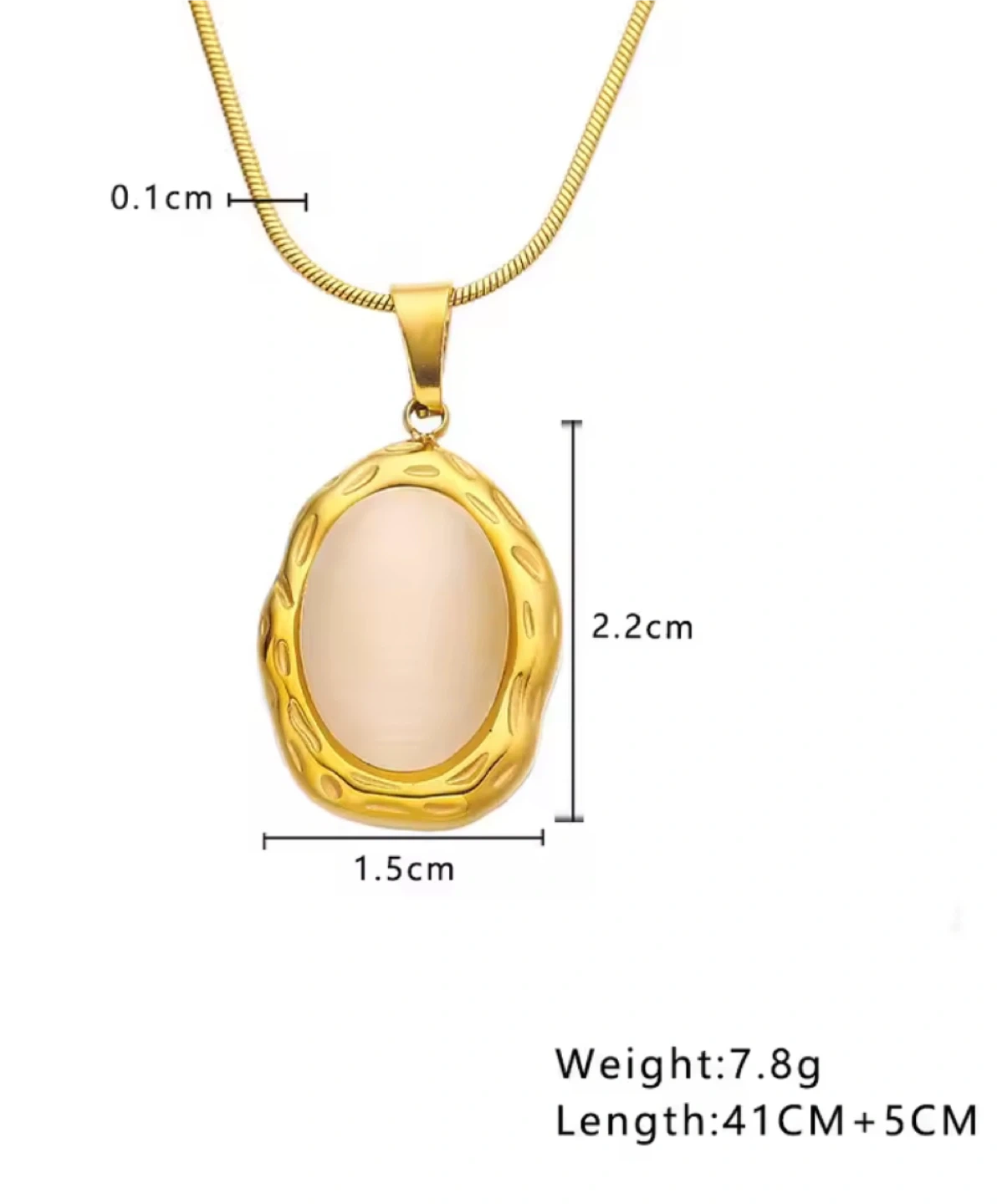 This is a beautiful gold-tone necklace. The pendant is an oval shape with a white stone. The chain length is 41cm + 5cm. ✔ Features of 18K gold plated stainless steel: