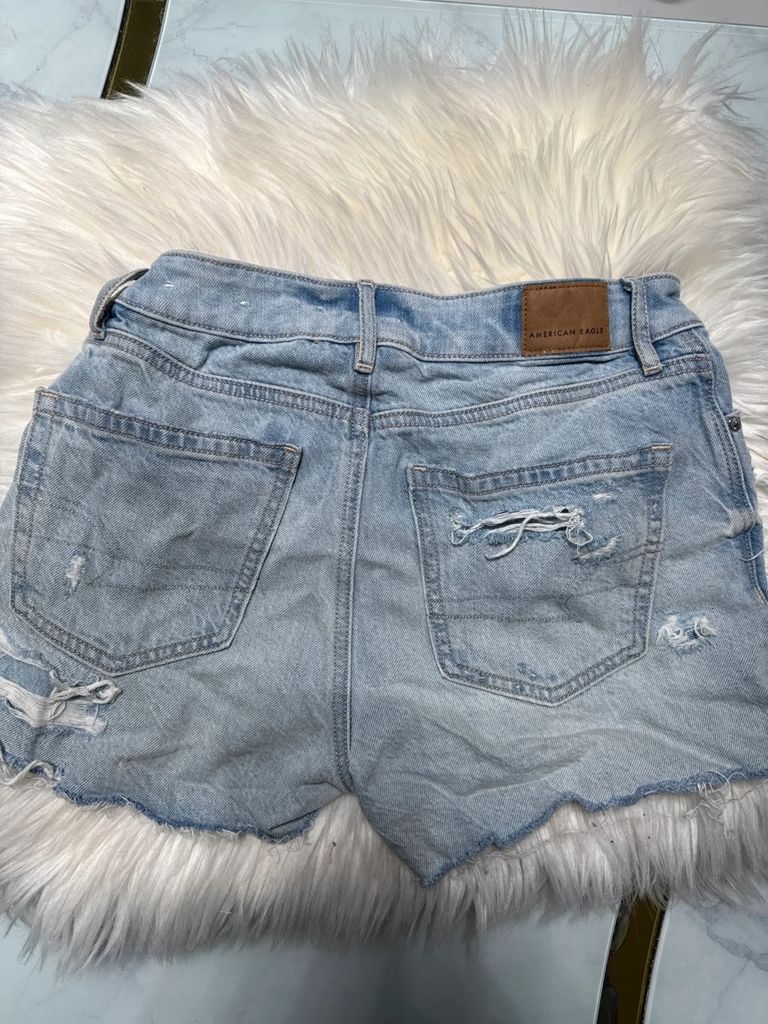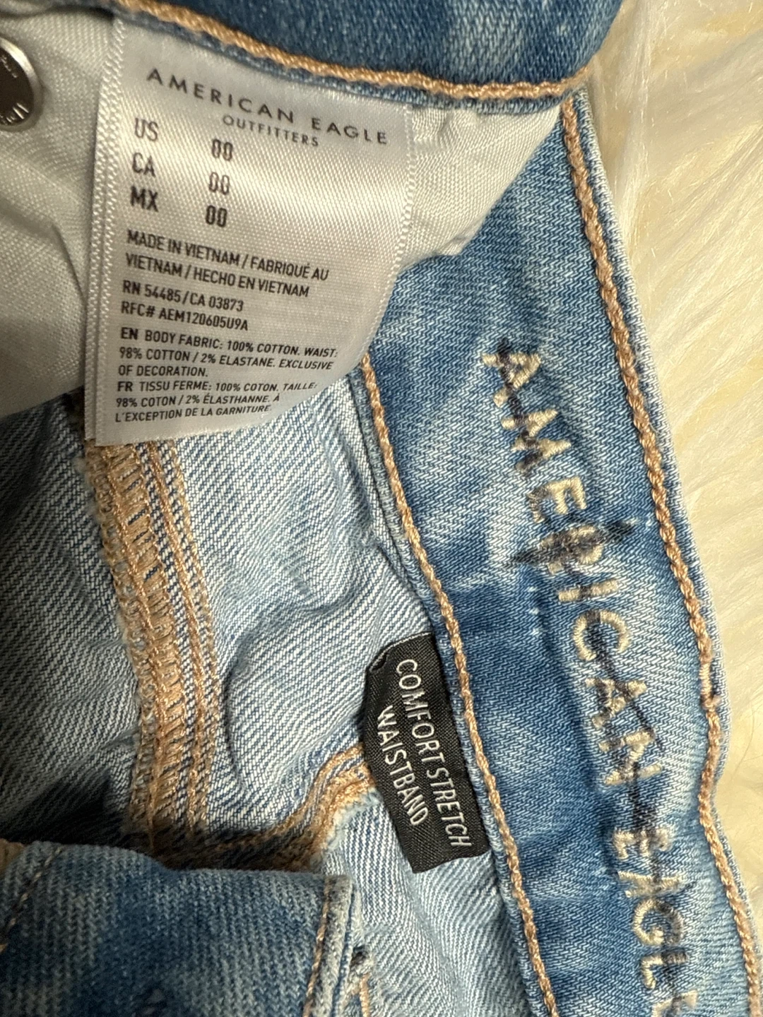 These are a pair of American Eagle denim shorts in size 00. They feature a comfort stretch waistband and a distressed design. The shorts are made from 98% cotton and 2% elastane.