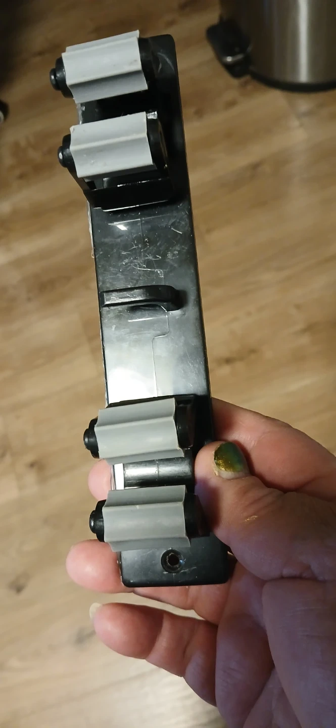 A mop and broom holder. It has a black base with gray rubber grips. It can hold up to three mops or brooms. It is in good condition