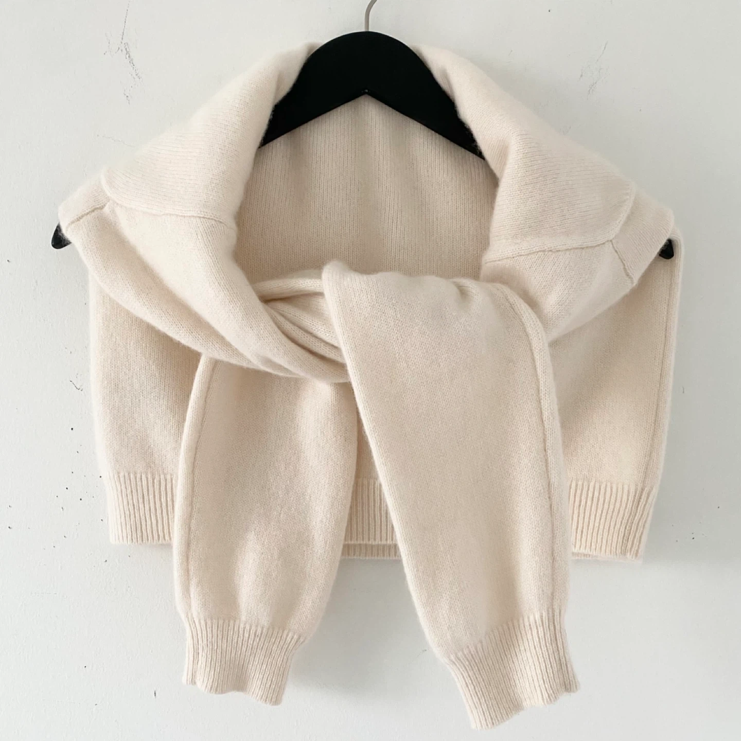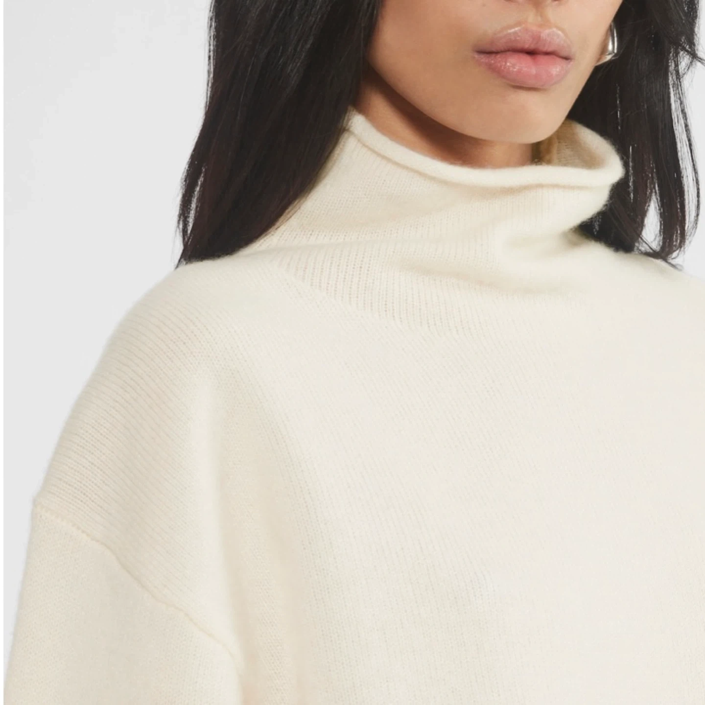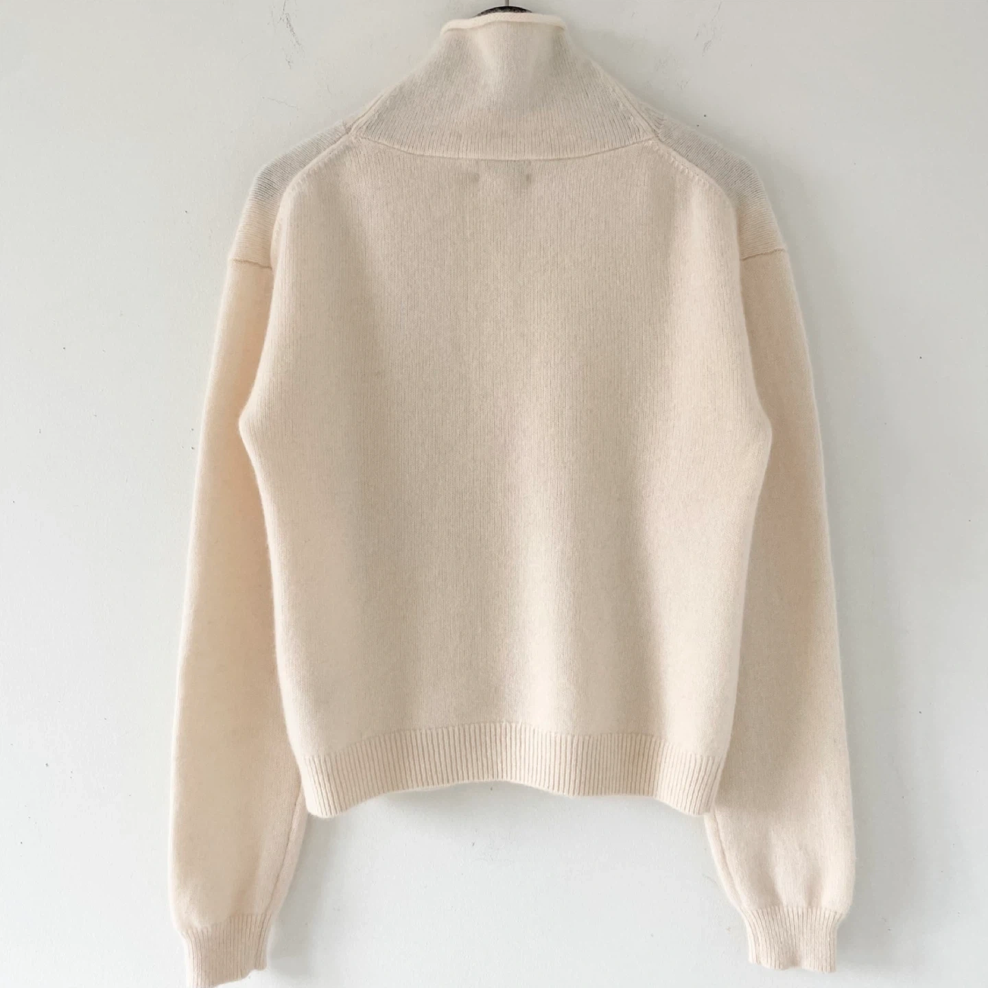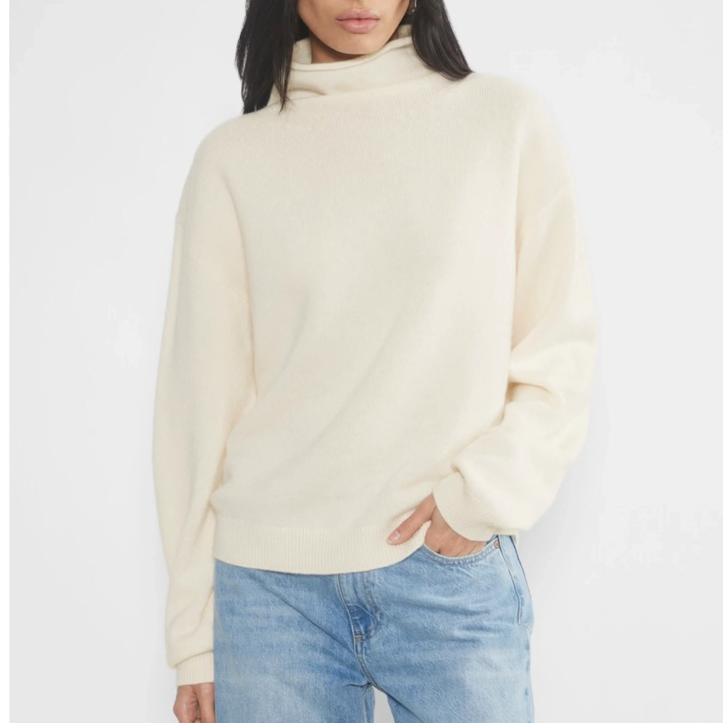 This is a fully fashioned mock neck sweater with dropped shoulders and a classic fit. It's knit with Aritzia’s Bare Cashmere - lightweight, all-season 100% Grade-A cashmere coveted for its unparalleled softness and warmth. The finest available. This cashmere is certified to The Good Cashmere Standard. It's constructed with a Jersey stitch for a soft drape and a smooth, flat feel. There's no staining, pilling or damage. It's clean and in excellent condition / like new.