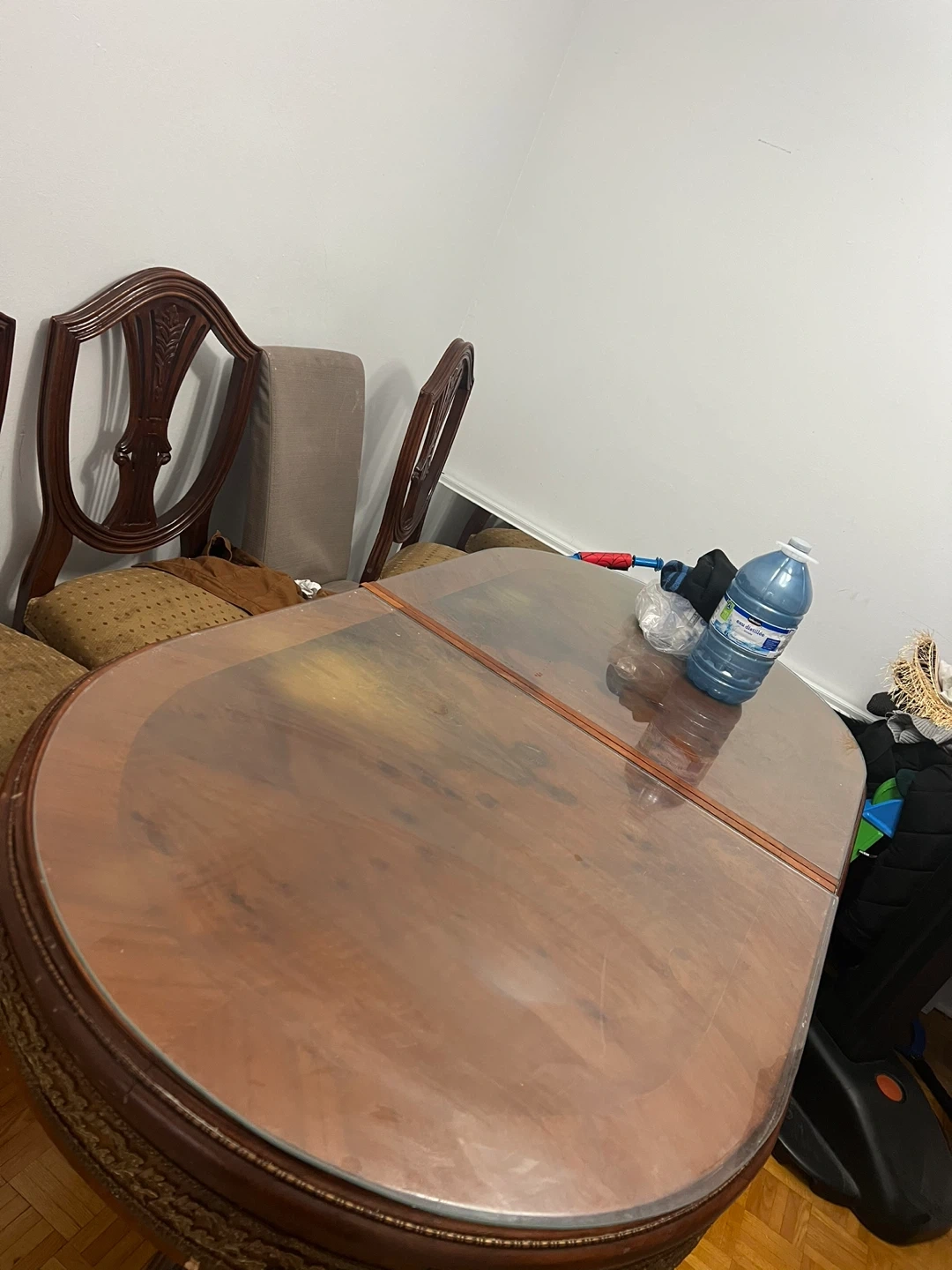 Selling an Elegant wooden dining table with glass top – strong, stylish and durable table with four same chairs and one extra!