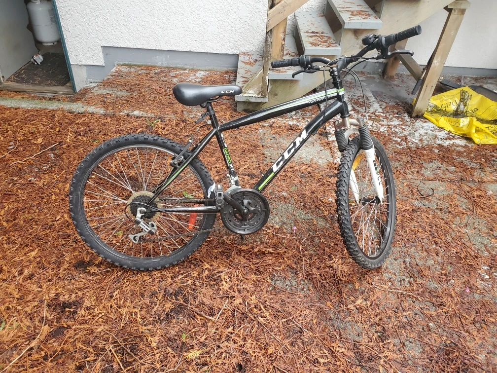 Selling a CCM mountain bike. It's in good condition and ready for some trails or cruising around the neighbourhood. It features a black frame with green accents.