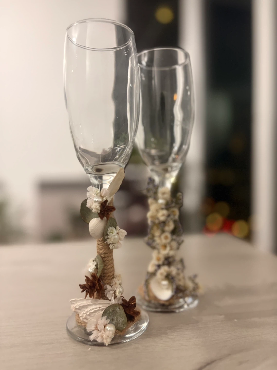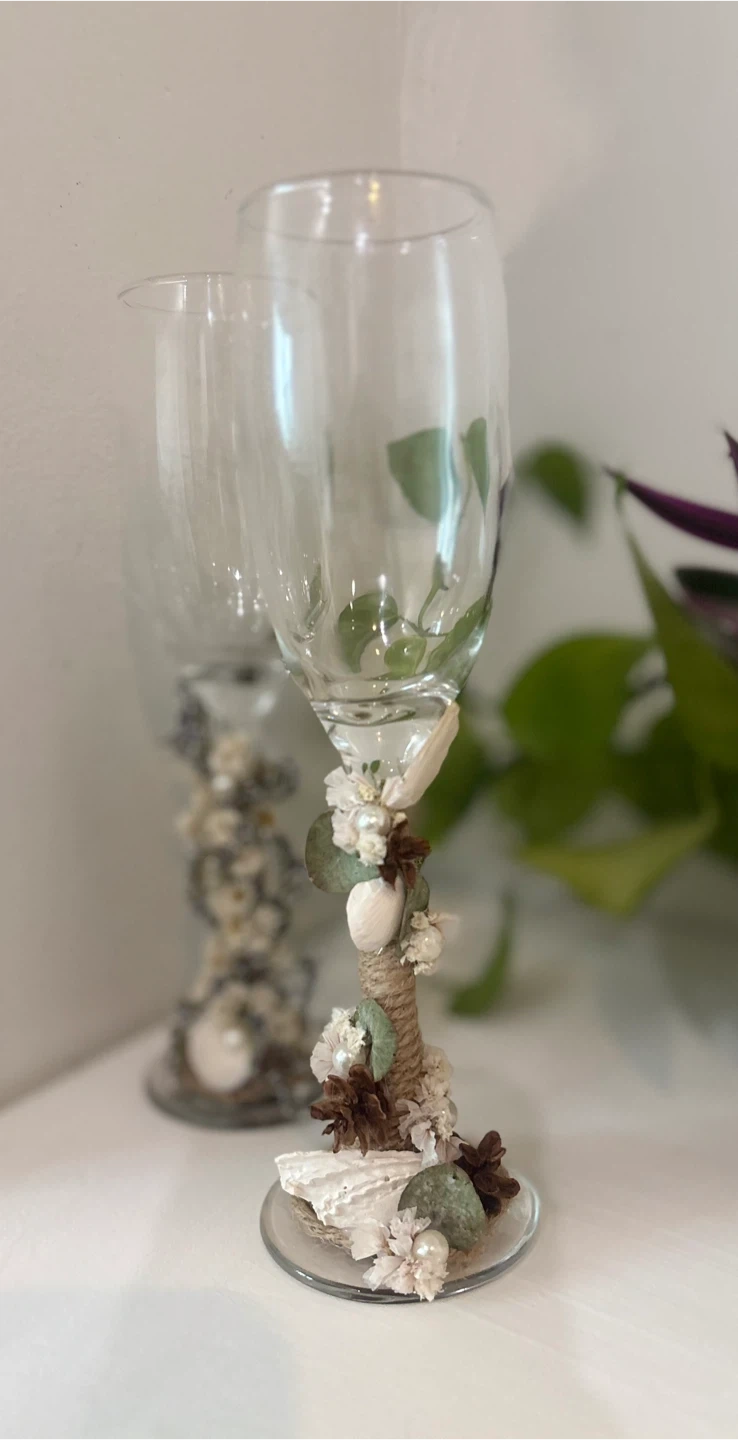 Selling a set of two decorative champagne flutes. They are clear glass and feature unique floral and pearl embellishments around the stem and base. Perfect for adding a touch of elegance to any celebration!