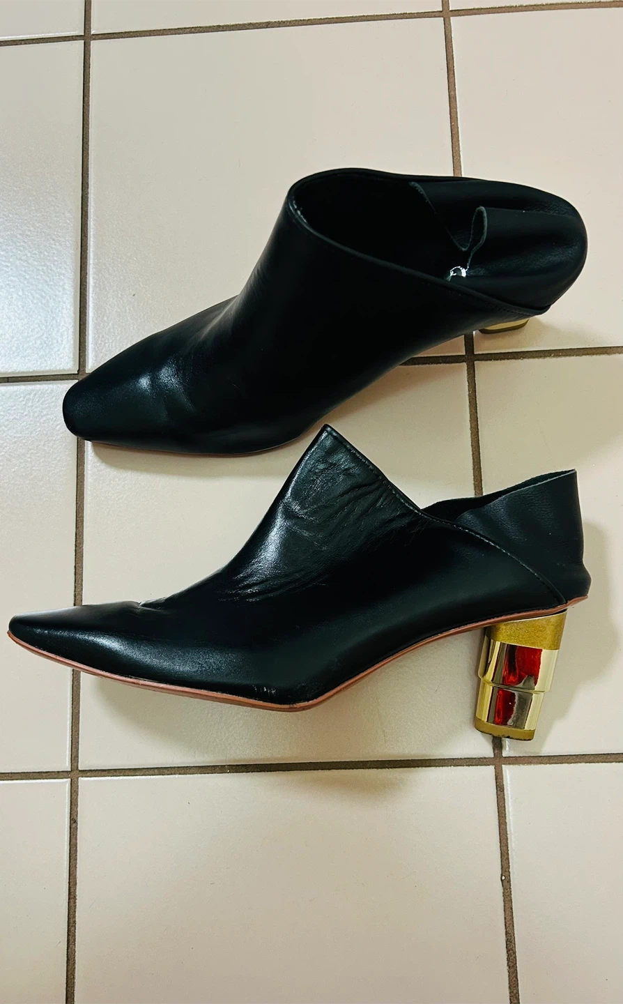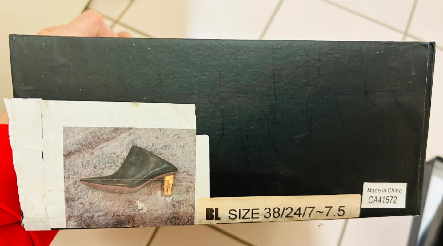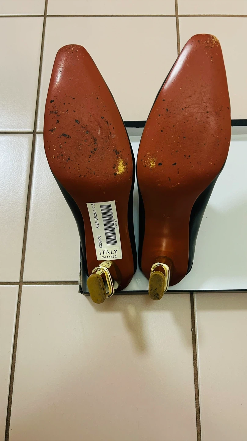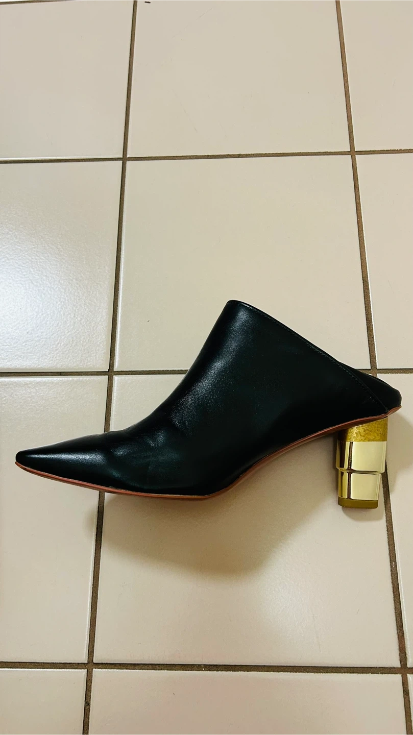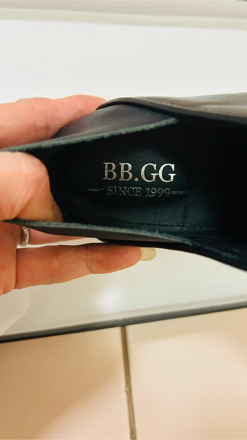 Selling a pair of BB.GG black leather mules. They are a size 7.5 (38/24/7.5). The shoes have a unique block heel. This pair of shoes has a special design in that the back part can be flipped up or down for wearing. Comes with the original box!