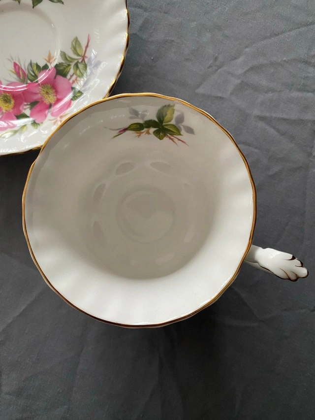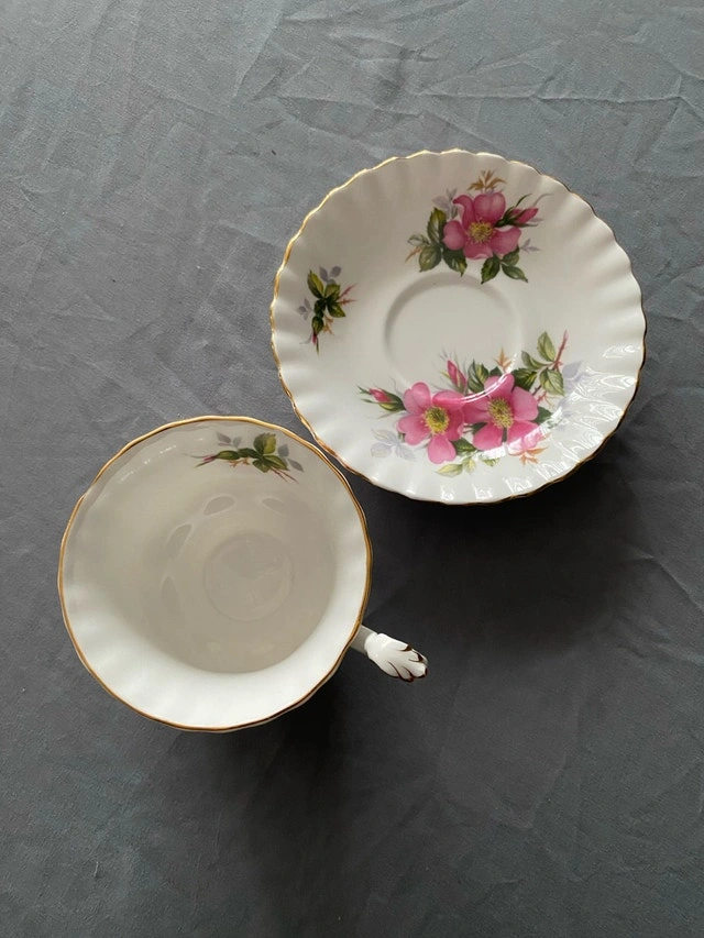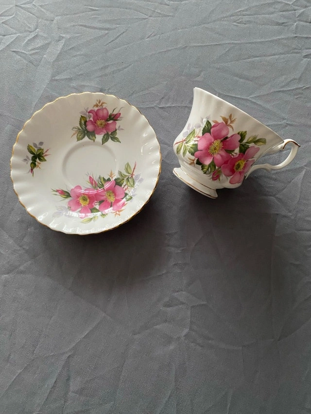 This is a Royal Albert Bone China teacup and saucer set in the 'Prairie Rose' pattern. This set is a charming addition to any tea lover's collection. The set is in excellent condition.