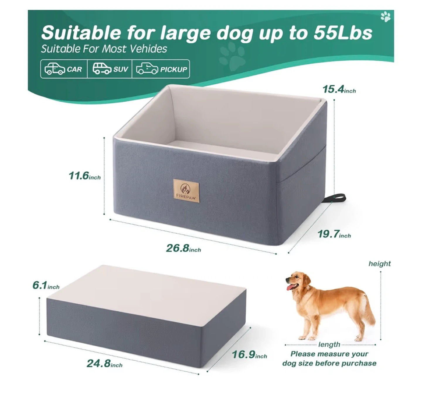 Selling a Firepaw dog car bed, perfect for large dogs up to 55lbs! It's grey and suitable for most vehicles, including cars, SUVs, and pickups.