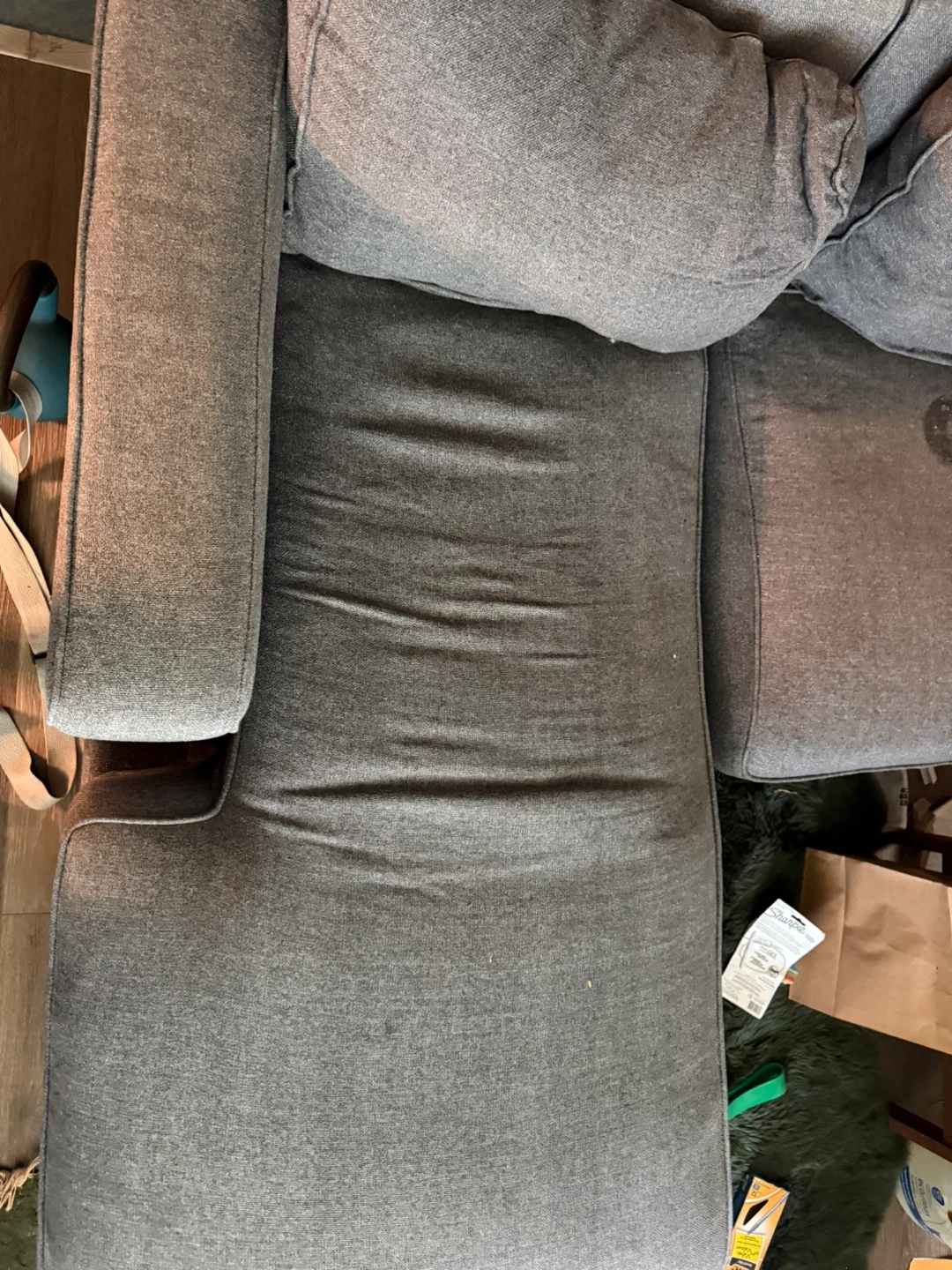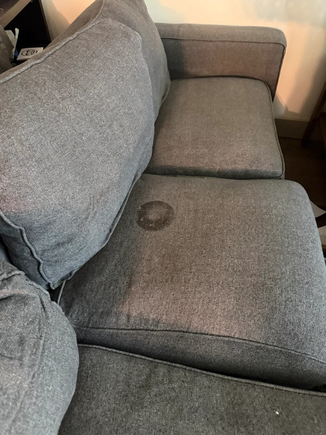 Selling a comfortable grey sofa with a chaise lounge. It has a stain on one of the cushions, as shown in the photos. Otherwise, it's in good condition and perfect for relaxing!