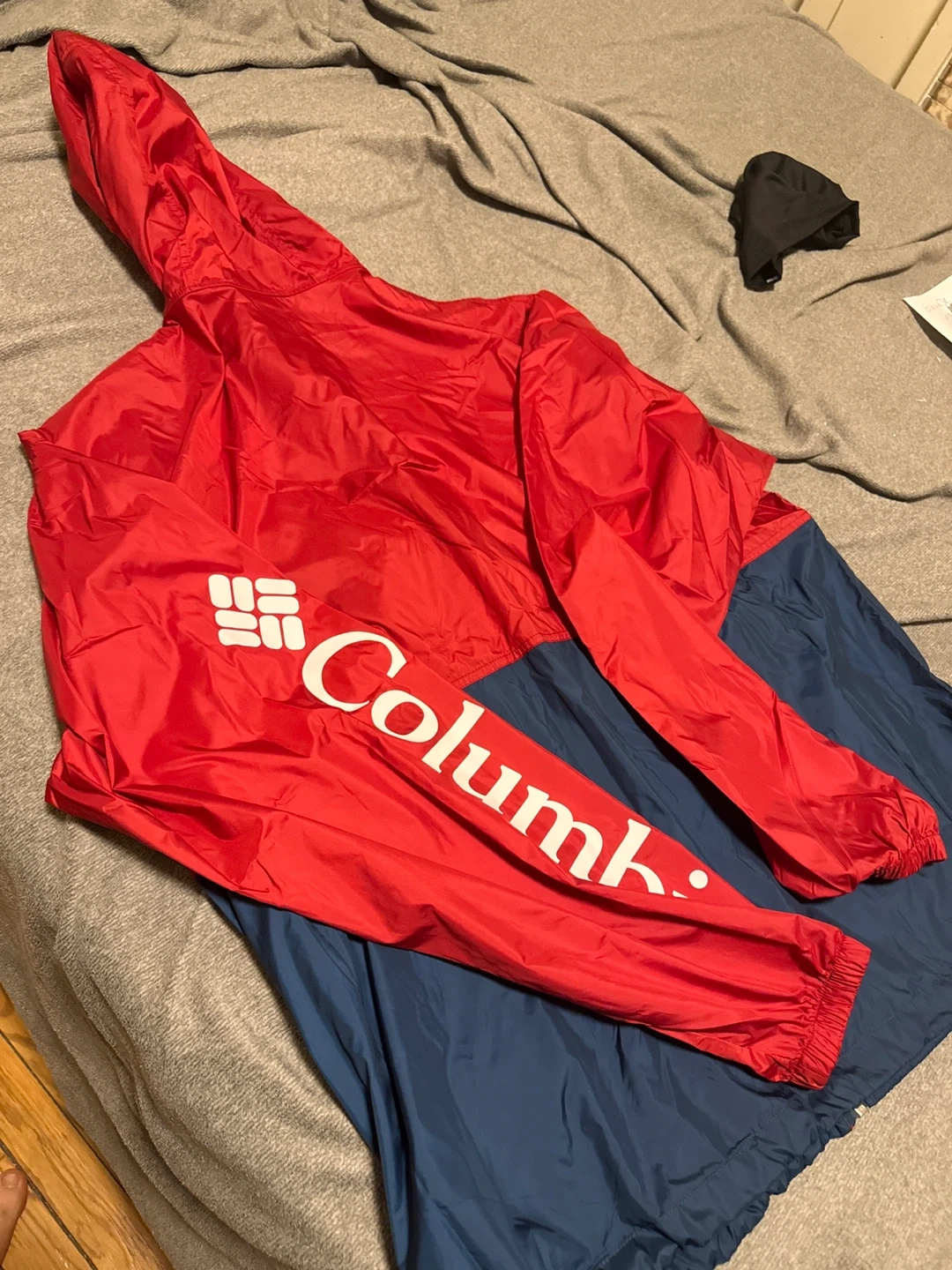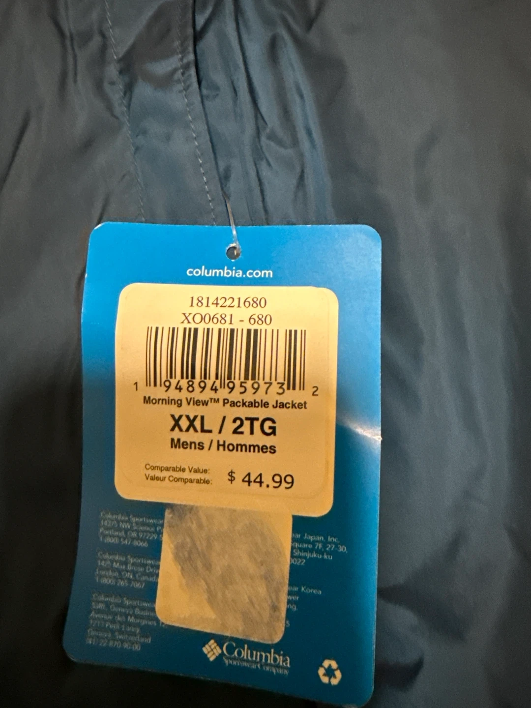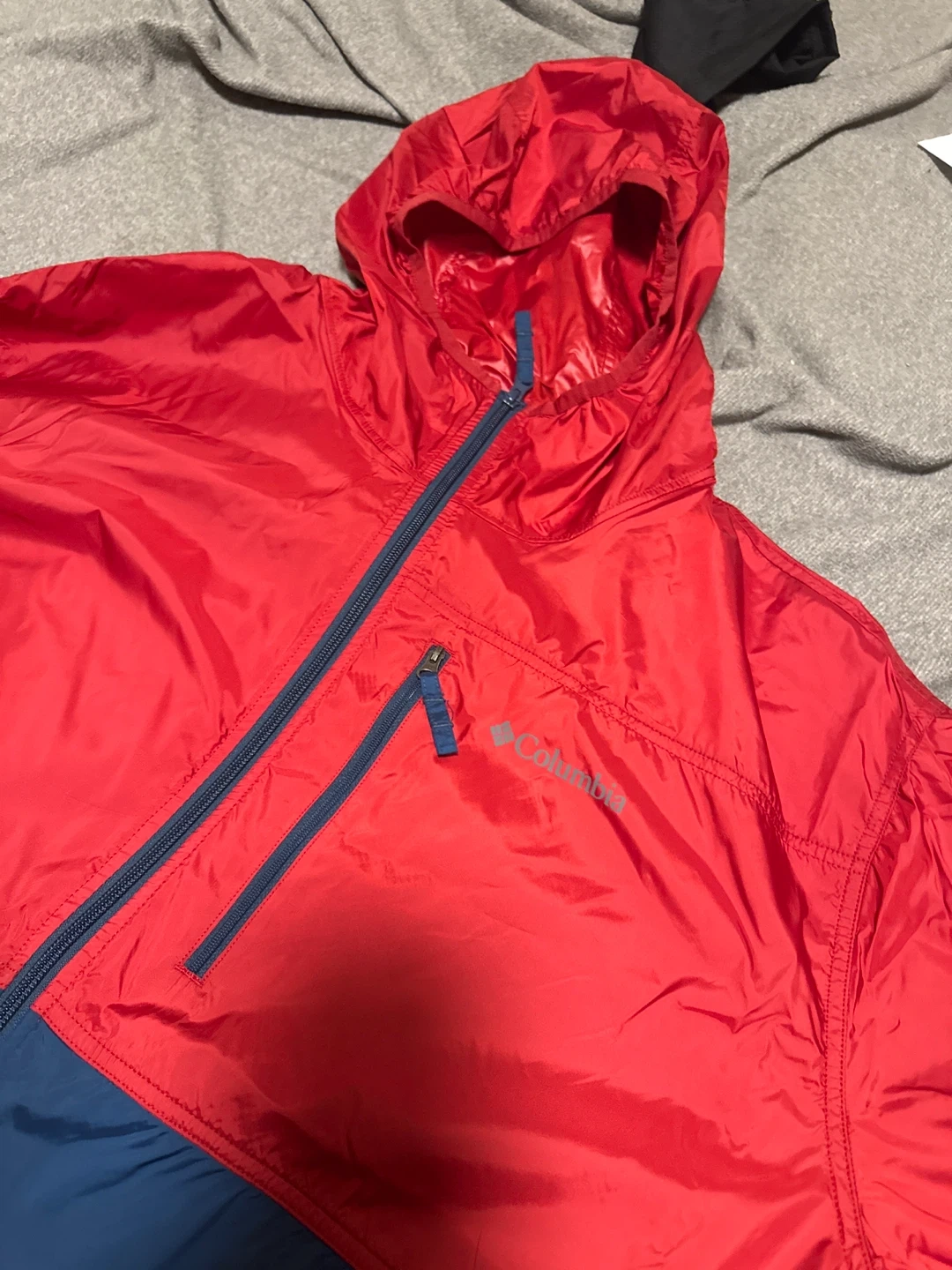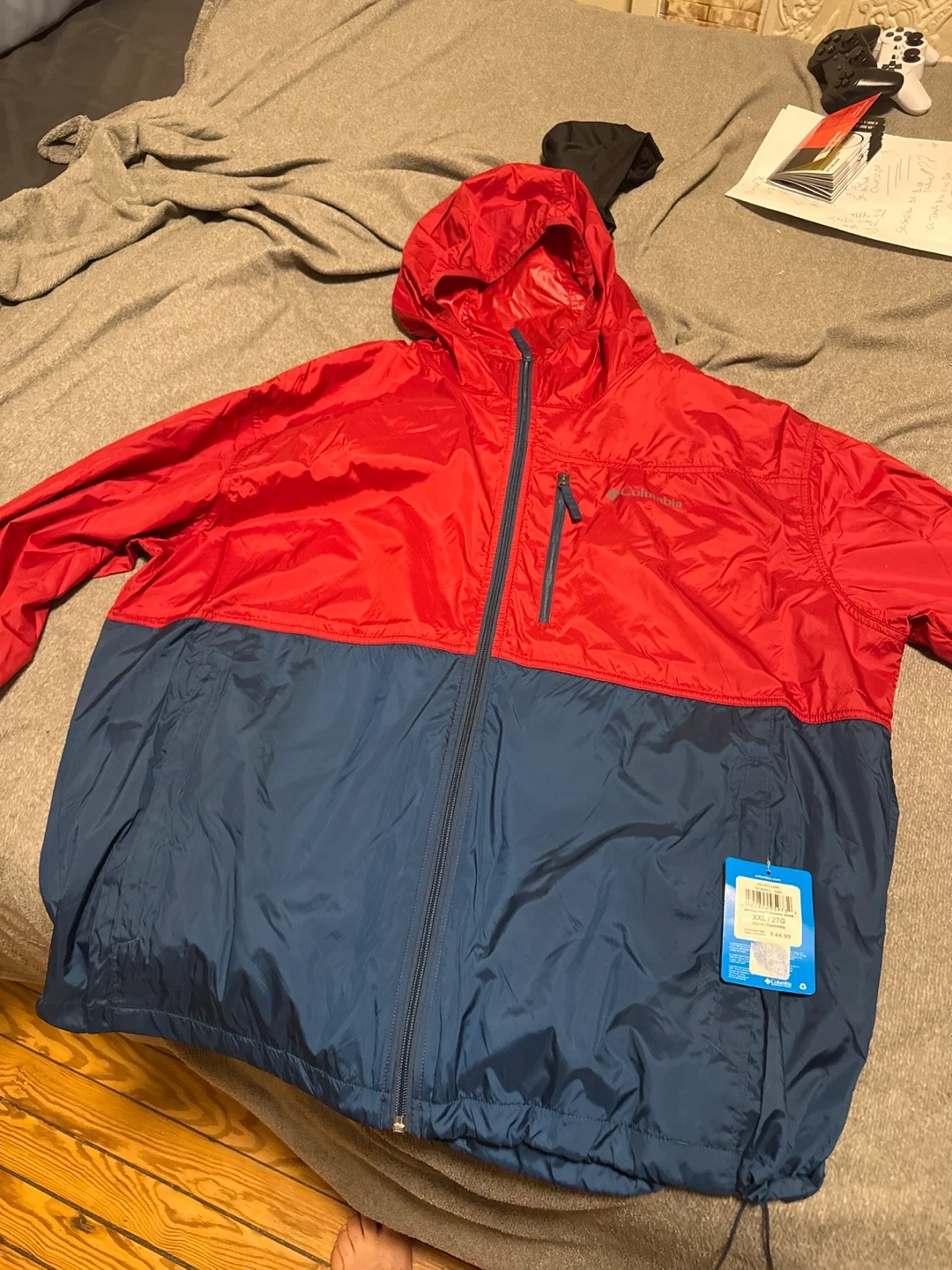 Selling a Columbia Morning View Packable Jacket in size XXL. It's a stylish red and blue color block design. The tag shows a comparable value of $44.99. Perfect for travel or everyday wear!