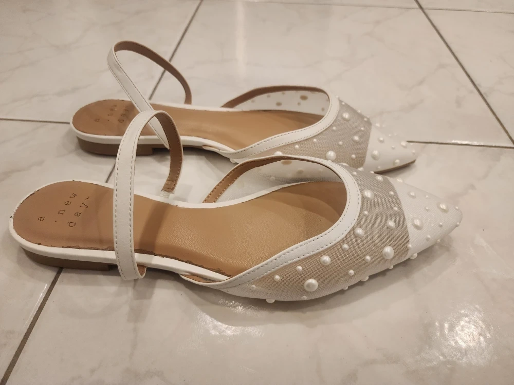 Cute pair of white pointed flats from A New Day! They're a size 8 and feature a sheer mesh design with pearl accents. Perfect for adding a touch of elegance to any outfit