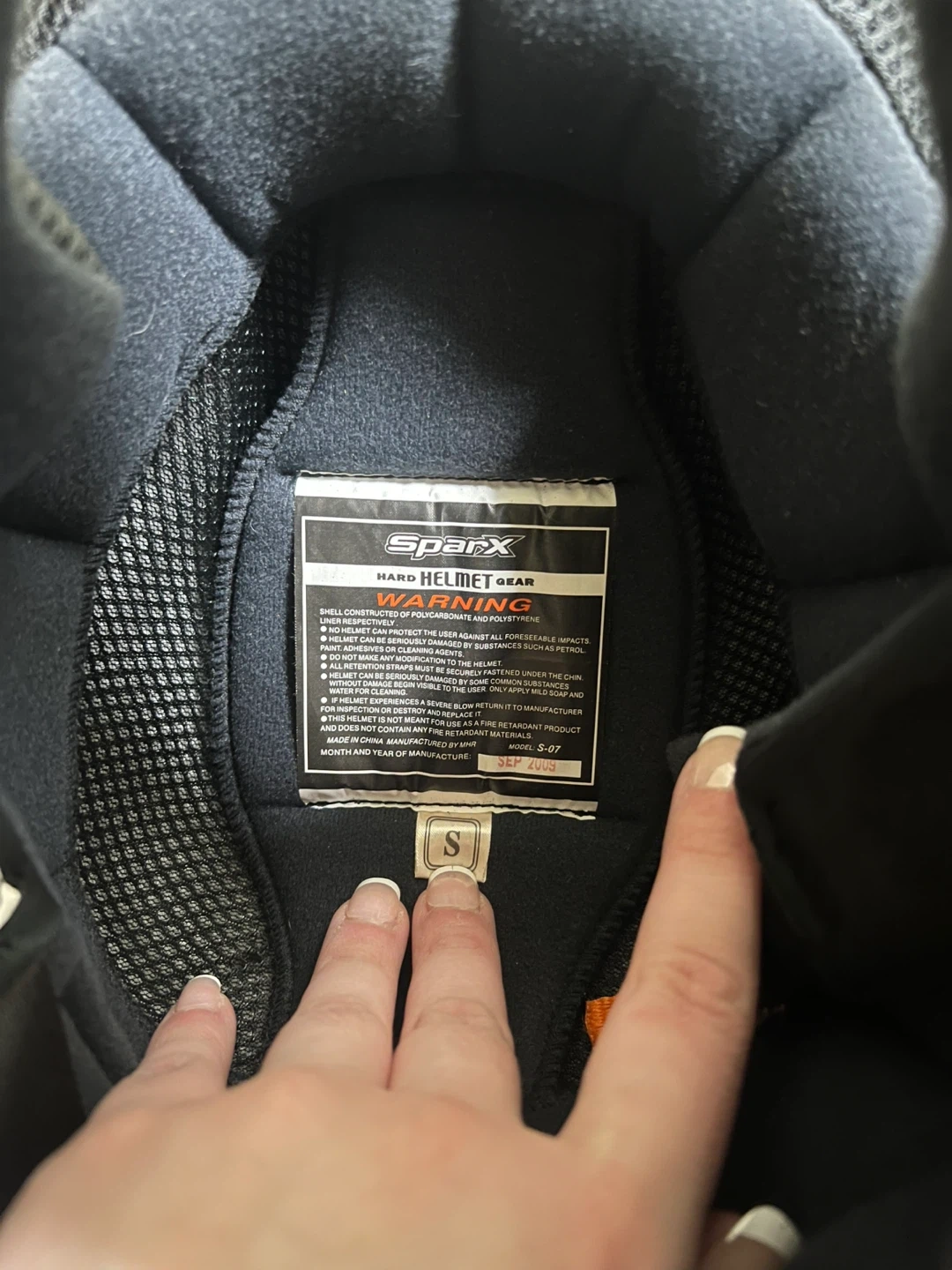 Thrifted SparX brand “Good v Evil” S-07 motorcycle helmet in a size SMALL. There’s some slight cracking and a missing piece on the right side of the face shield. The chin buckles are fully functional