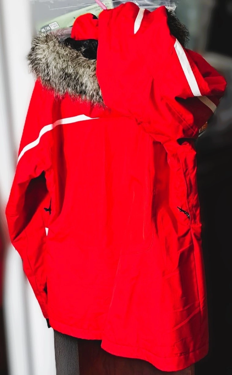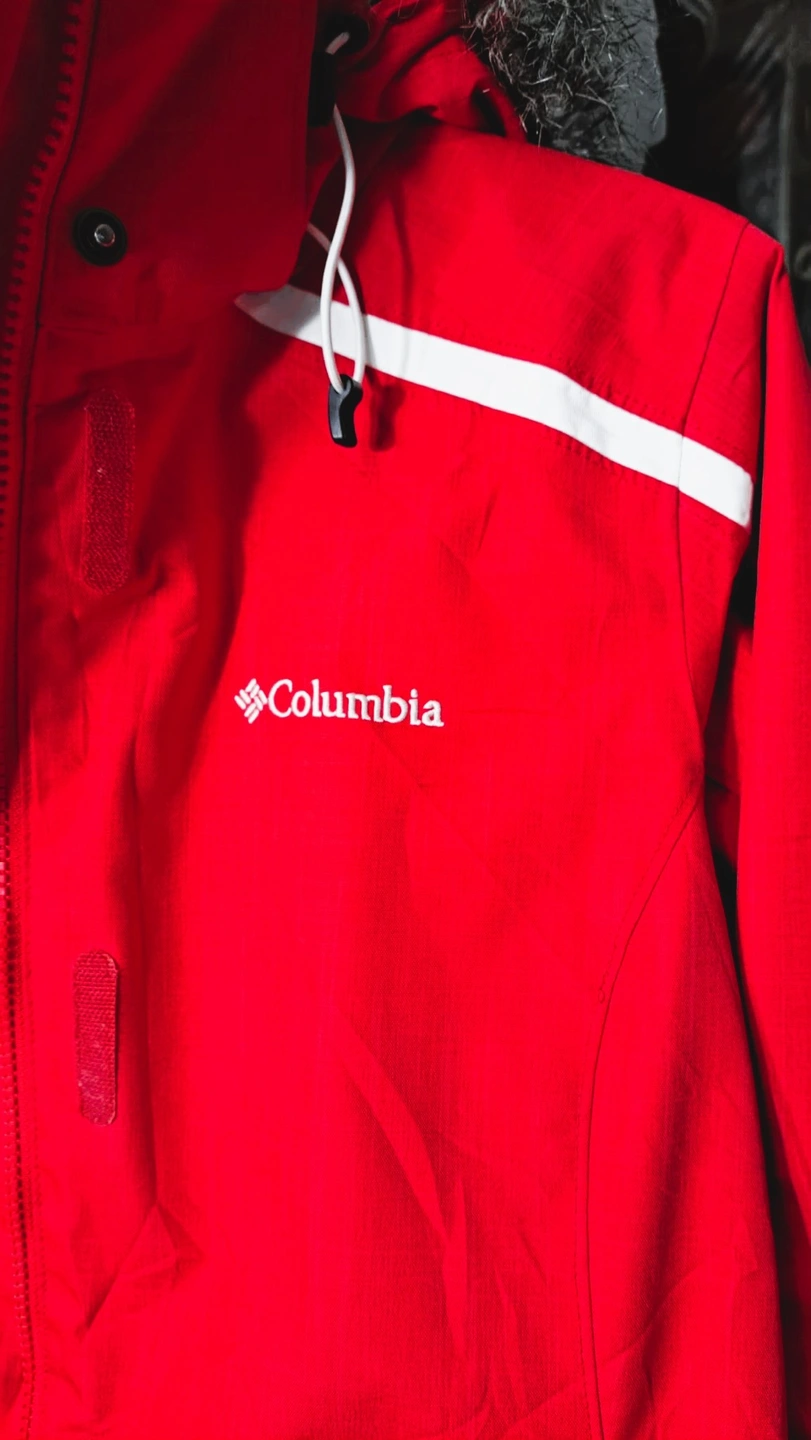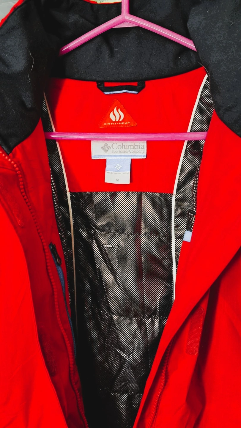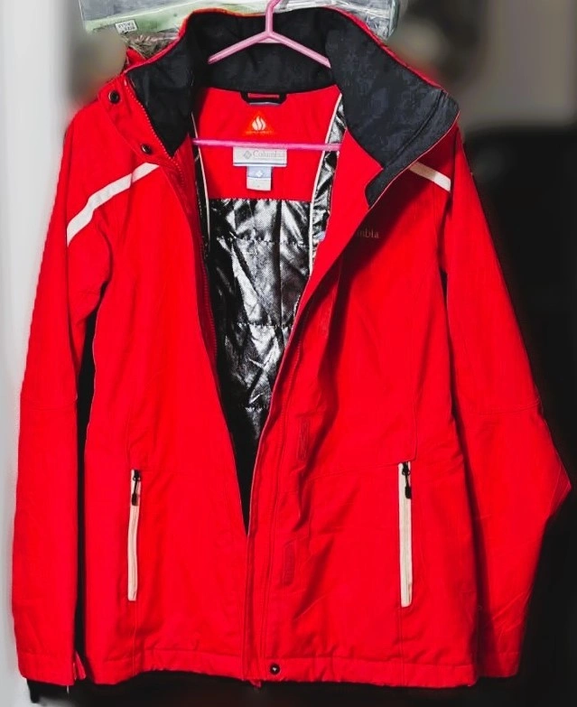 This beautiful waterproof/breathable jacket in red hibiscus or deep blush featuring Omni-Heat reflective for extra warmth is designed as an interchange system. The inner lining can be zipped out and worn separately. It features a hood, zippered hand pockets, and underarm venting, typical for a ski jacket. It has embroidered Columbia Logo. It has removable, adjustable storm hood faux fur. It is 100% polyester Matte Melange which offers a blend of practical performance characteristics and a sophisticated, textured appearance. It looks like New. Only worn once but with very minimal sign of wear on the lower part of sleeves and not so visible tiny hole [please check photos]