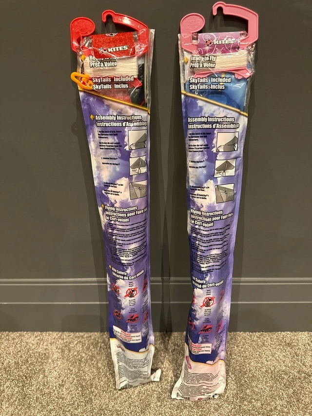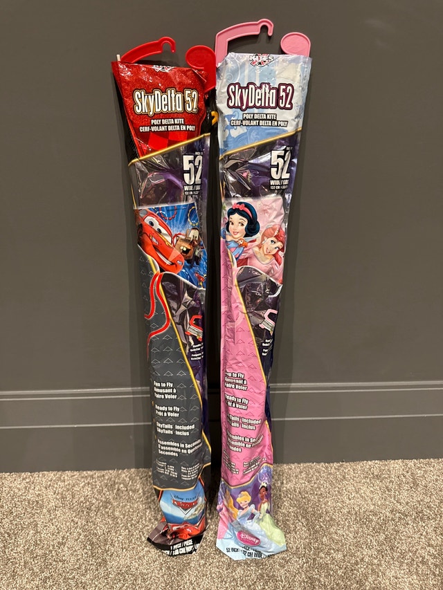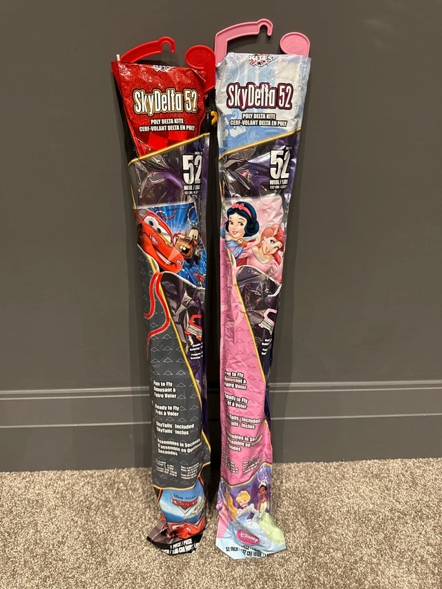 Get ready for some high-flying fun with this set of two brand-new Disney kites! One features Lightning McQueen from Cars, ready to race across the sky, while the other showcases a collection of beloved Disney princesses. Each kite is still sealed in its original packaging, promising hours of outdoor entertainment. Fly one on each hand like you're conducting an orchestra of the sky! If the ad is up, they're ready to soar into your hands!