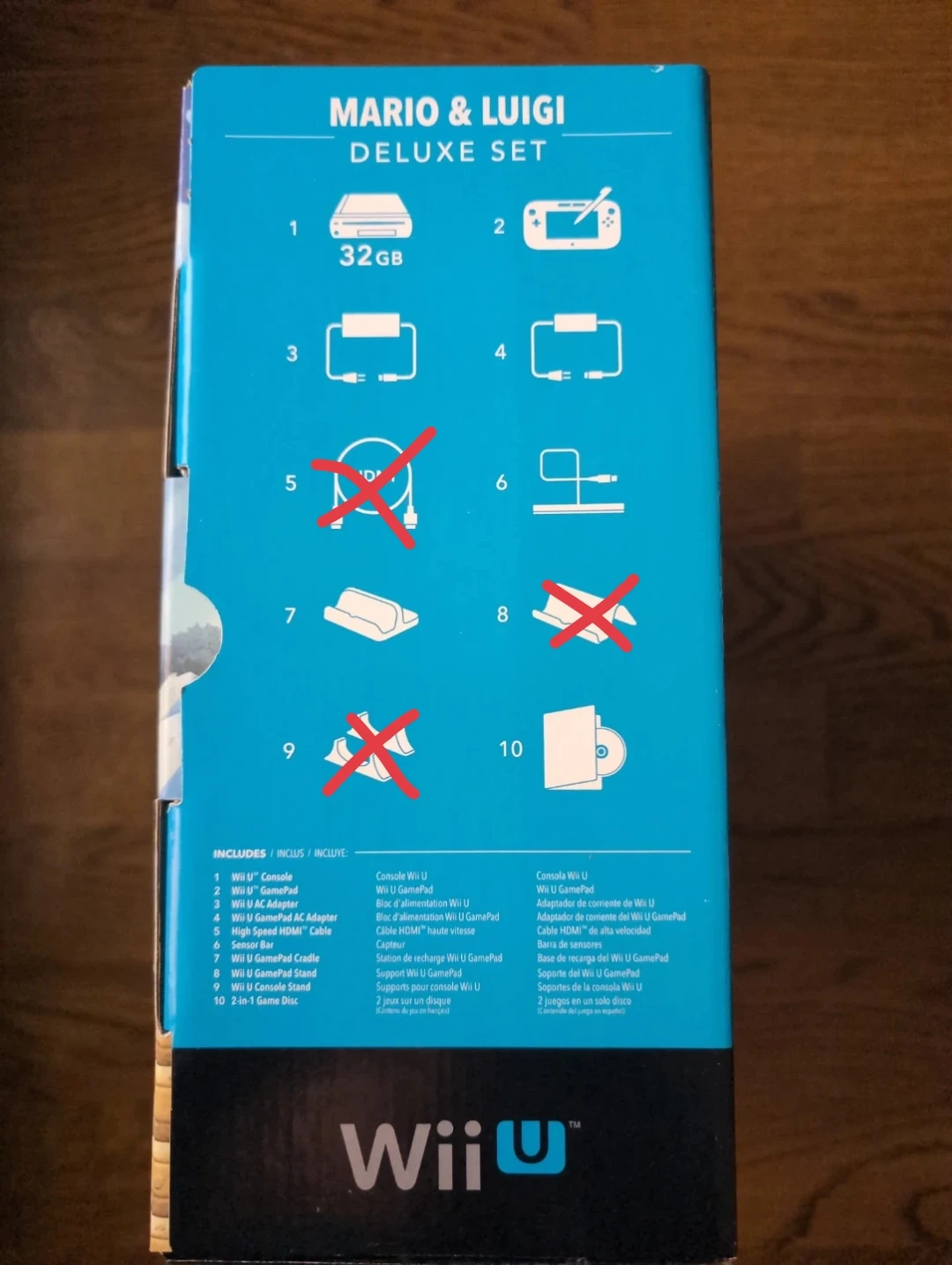Selling a Nintendo Wii U Mario & Luigi Deluxe Set with 32GB of storage. It comes with the original box and includes the Wii U console, gamepad, AC adapter, sensor bar, gamepad cradle, and game disc. Not all original items are included and have been crossed off in the picture displaying original items that were included in the set.