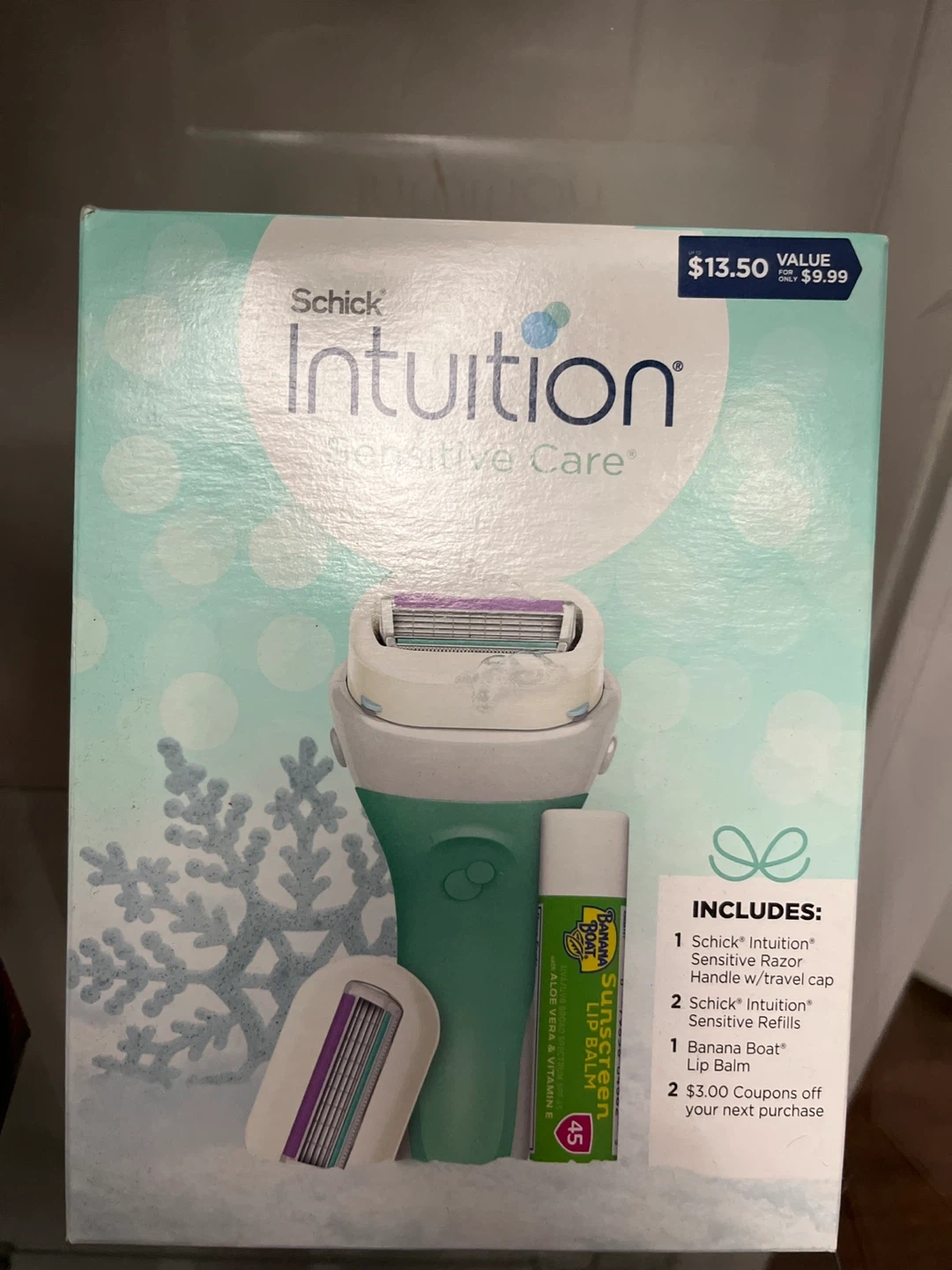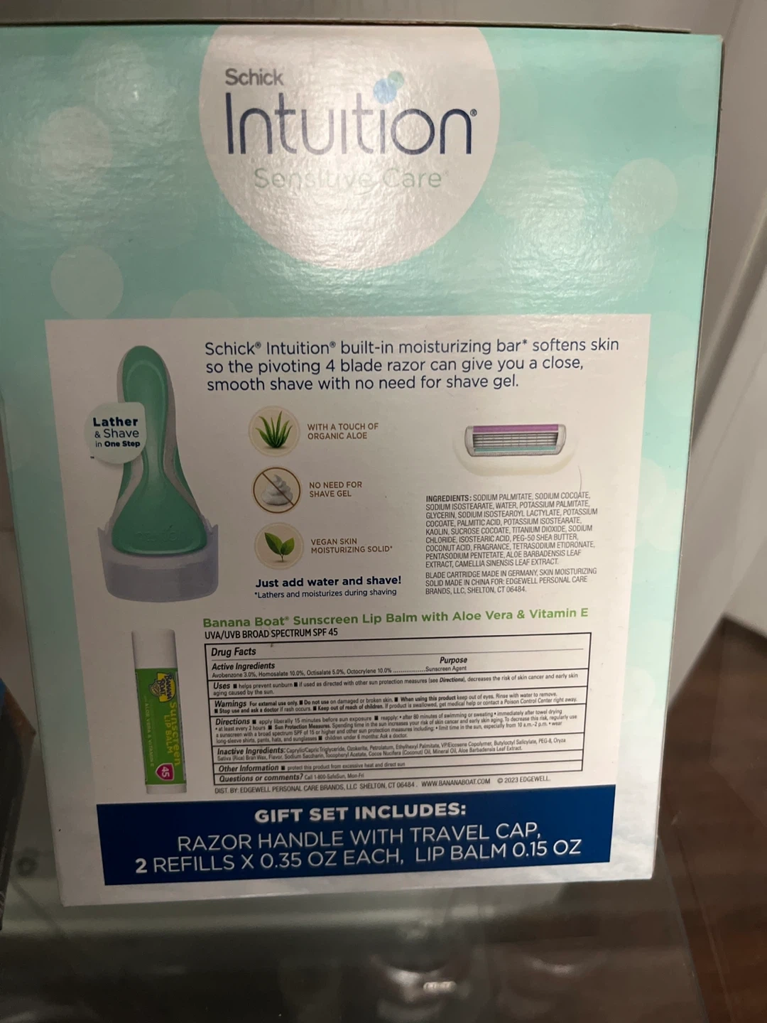 Selling a Schick Intuition Sensitive Care gift set! It includes a Schick Intuition razor handle with a travel cap, two Schick Intuition sensitive refills, and a Banana Boat lip balm. Great value!