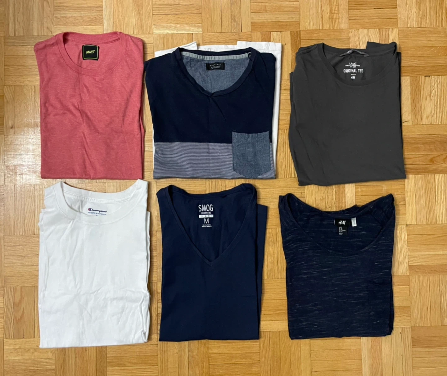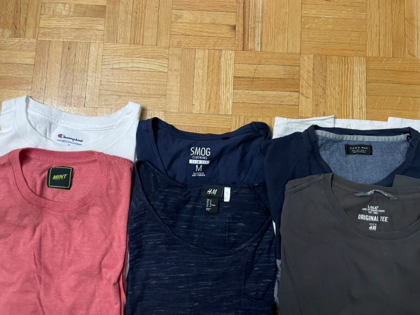 Selling a bundle of men's t-shirts, all in size medium. There's a variety of styles and colours from brands like Mint, Zara Man, H&M, Smog, and Champion. They are in good condition and ready for a new wardrobe!