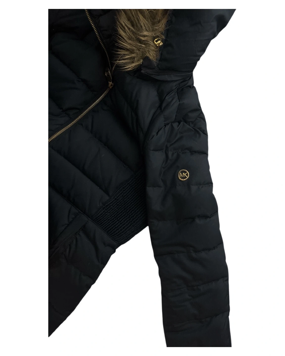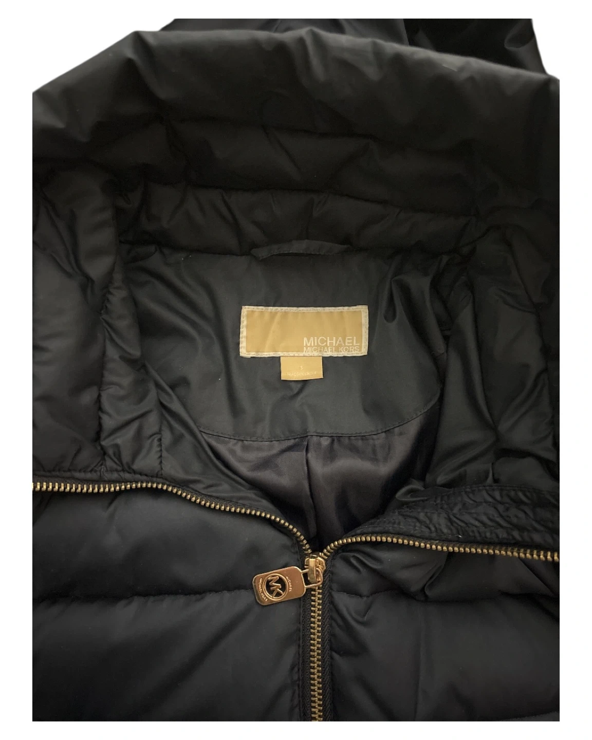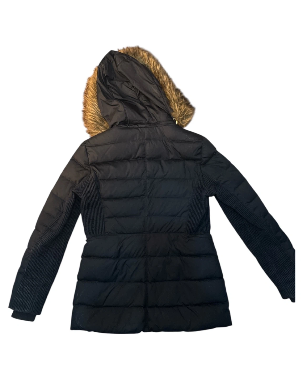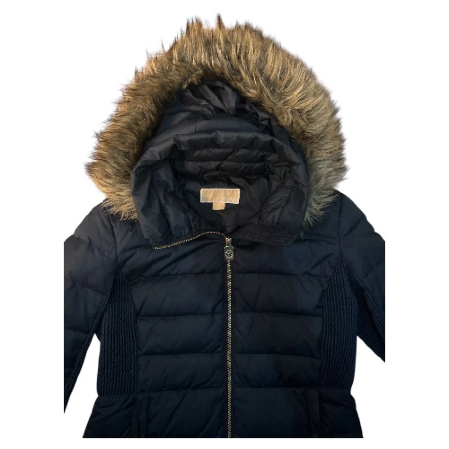 Selling a Michael Kors Navy puffer coat. It's a size S and features a faux fur-trimmed hood (which can be removed by zipper). Smoke free home.