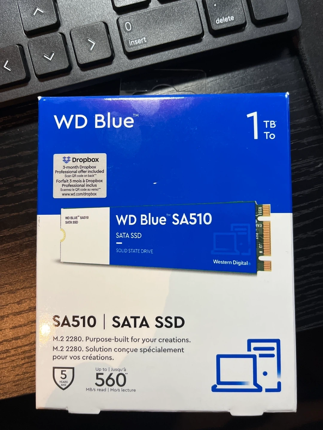 Selling a brand new WD Blue SA510 1TB SATA SSD! It's still in the box and ready to boost your computer's performance. This is a M.2 2280 form factor SSD, perfect for your creative projects and general use. It boasts read speeds up to 560 MB/s. Also includes a 3-month Dropbox Professional offer!