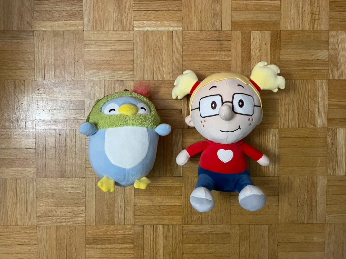 Two cute plush toys are up for grabs! One is a blue penguin wearing a green hat with a little red feather. The other is a girl with blonde pigtails, glasses, a red shirt, and blue pants. They're both in great shape and ready for a new home