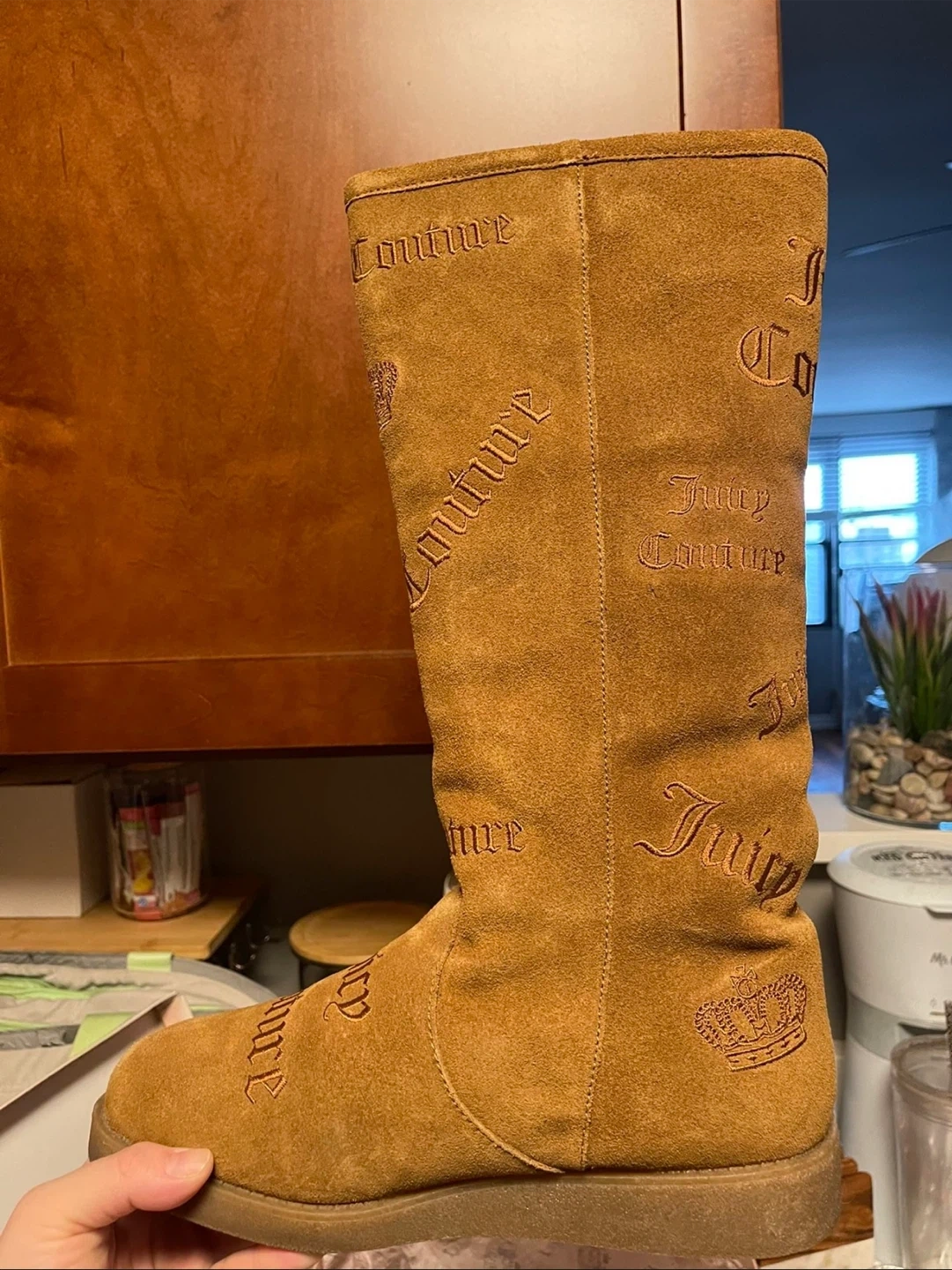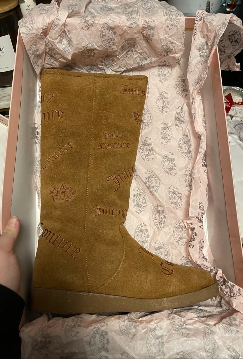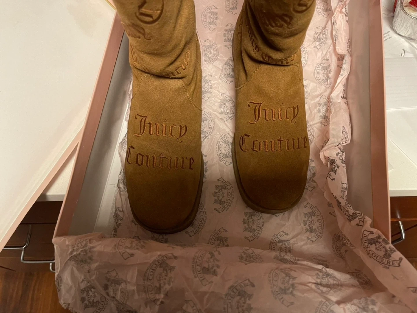 NEW MINT NEVER WORN JUICY COUTURE BOOTS. These are REAL boots. Mid knee high length boots. Comes in a chestnut color and officially the tobacco split suede. NEVER USED. Never worn. Size 9 women’s. I would say runs true to size with a little extra wiggle room. From a smoke free, pet free home. The box comes with the boots. Cash only please and pick up only. I am in Lakeview East, Chicago near Belmont and Broadway. If you are interested please send me a message! Thank you!
