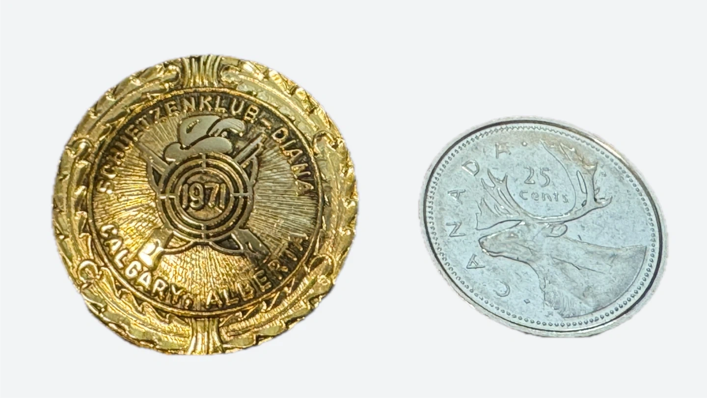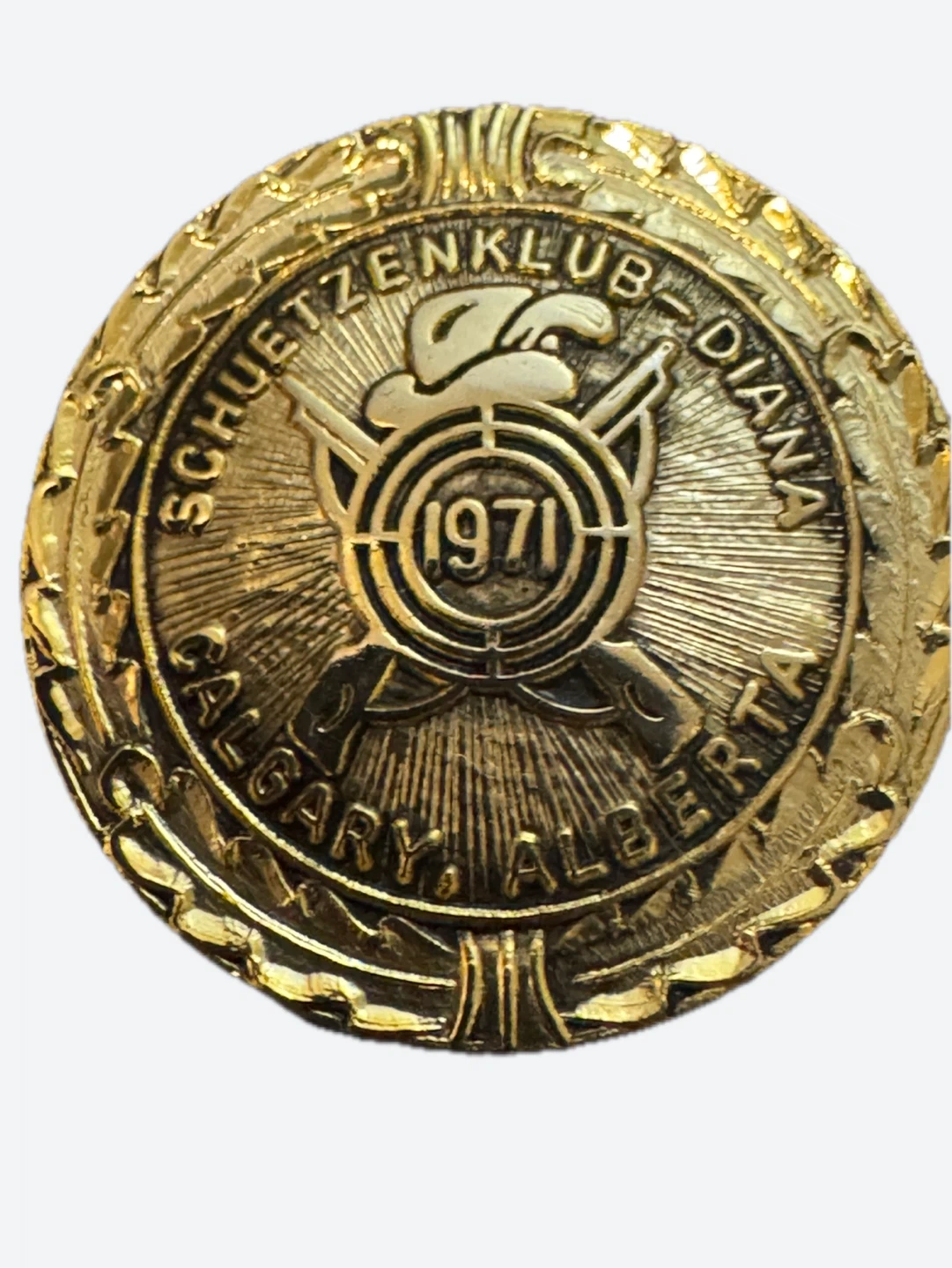The item is a commemorative medal or pin for the Schuetzenklub Diana, a Swiss rifle club in Calgary, Alberta, from 1971.