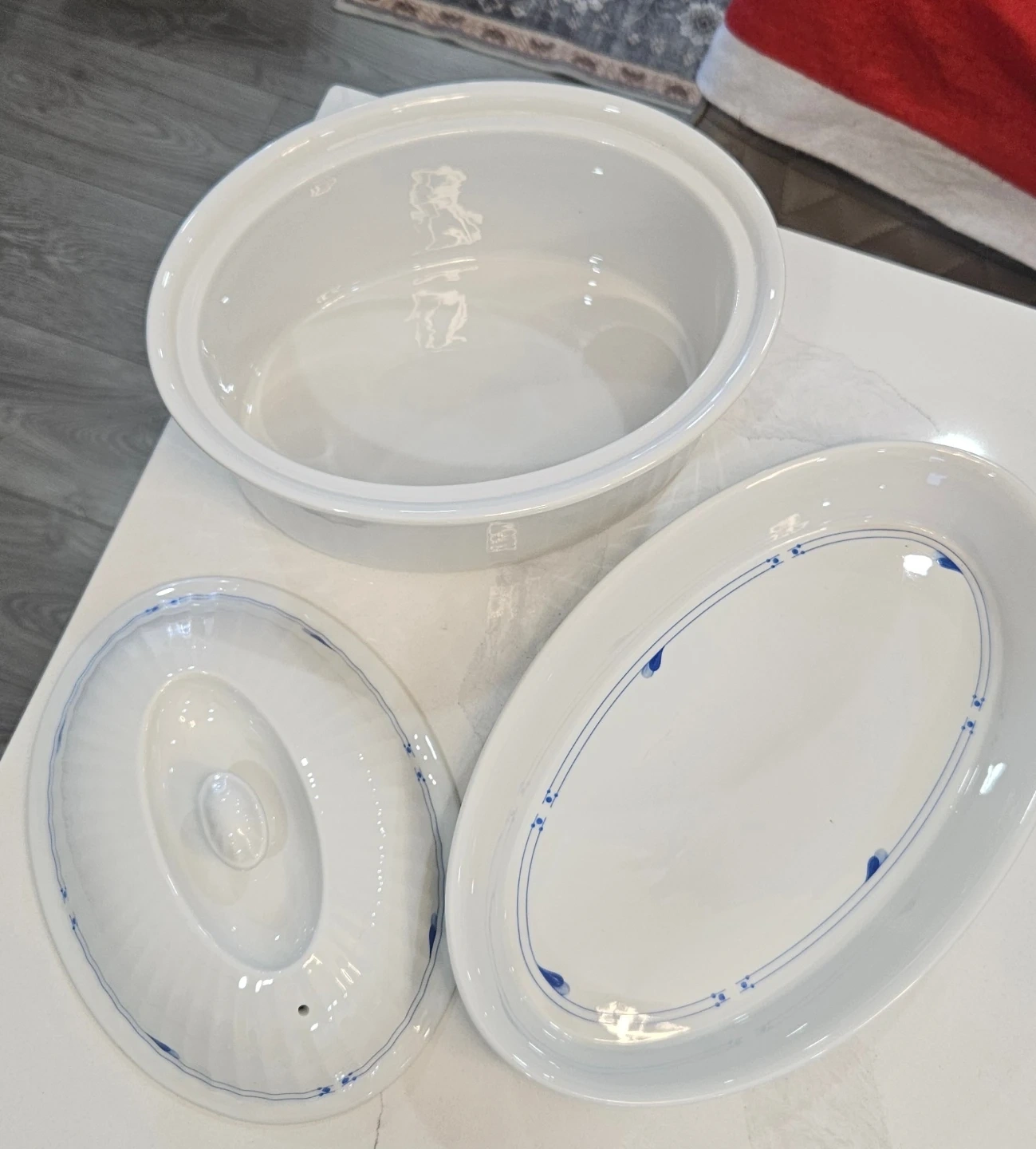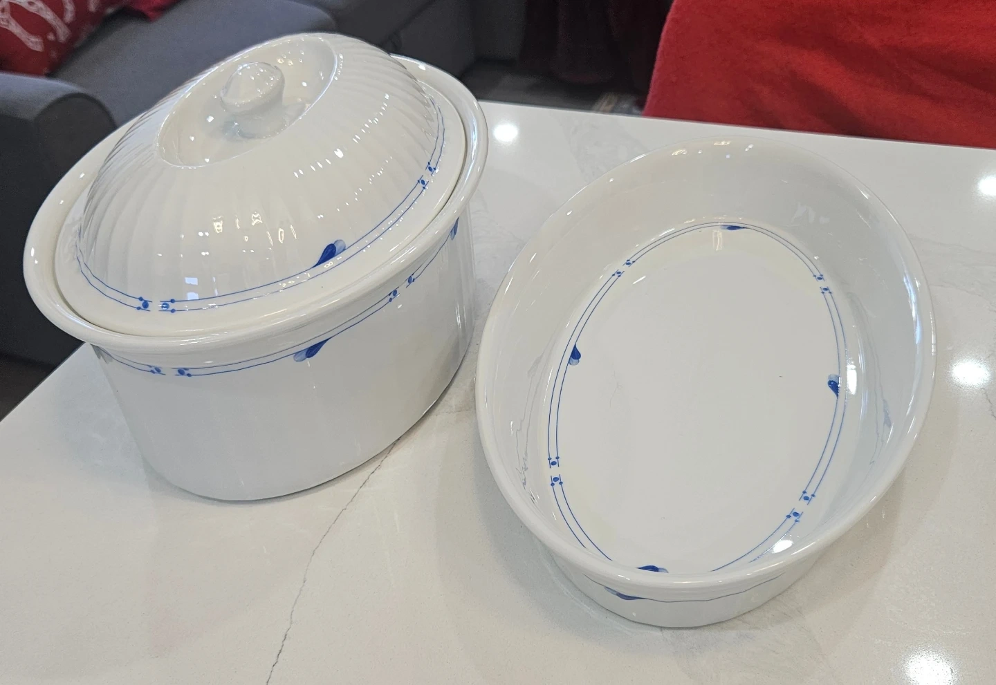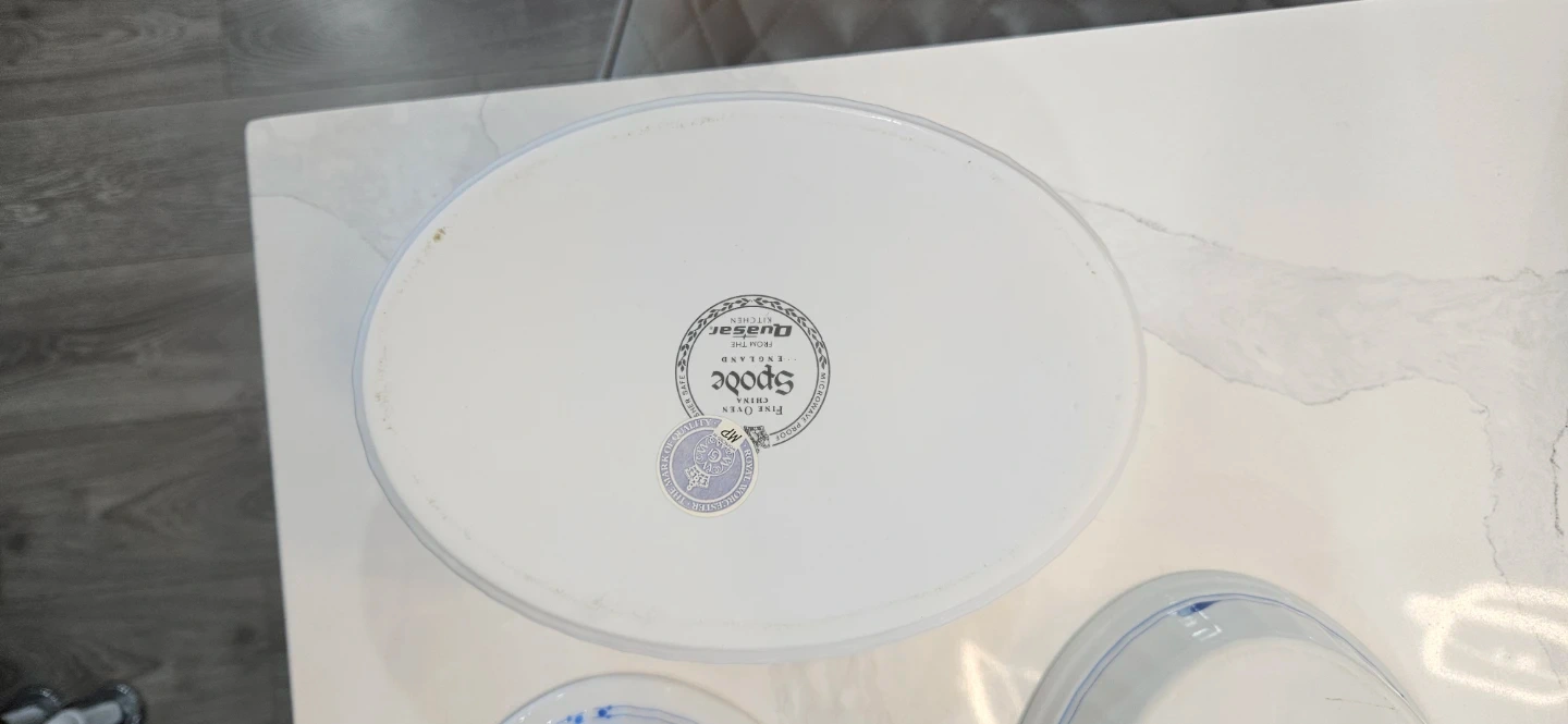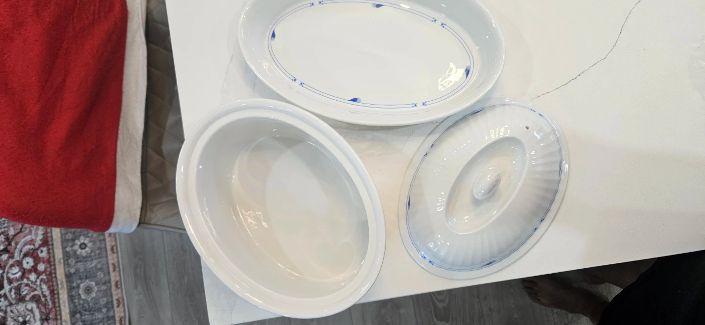 Selling a Spode England dish set! It's in great condition and includes a lidded casserole dish and an oval serving dish. The set is white with a delicate blue floral pattern around the edges. Perfect for serving up your favourite dishes!