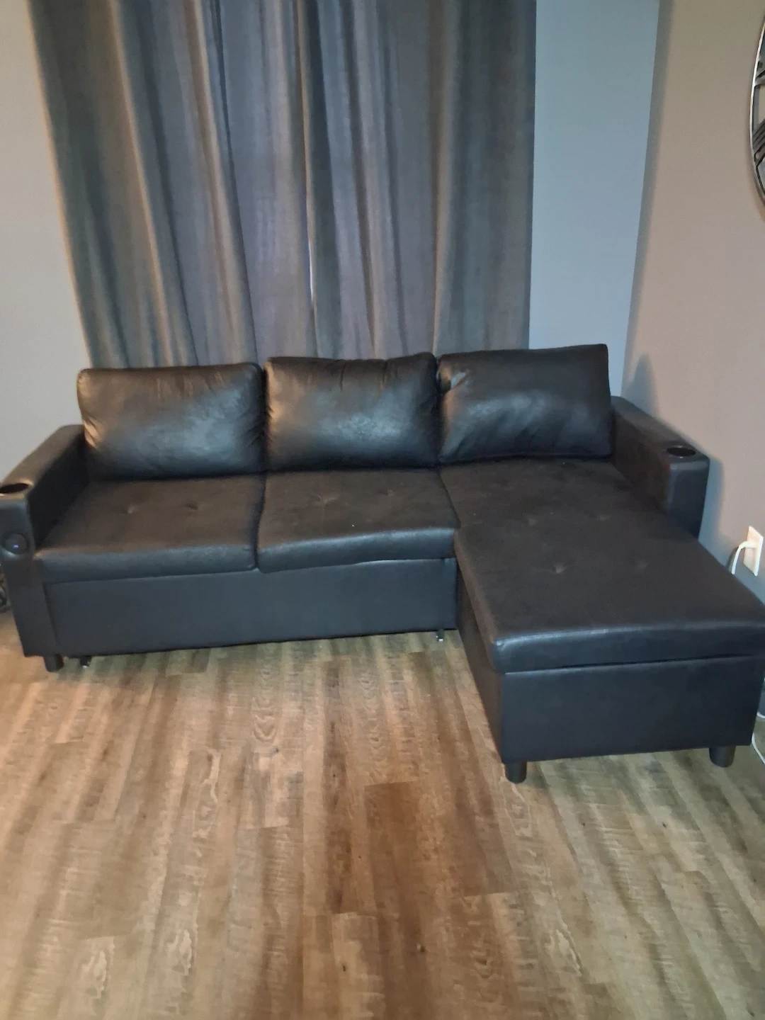 Selling a black sectional pull out sofa. It's in great shape and ready for a new home! It features a chaise lounge and a handy storage compartment, perfect for blankets or pillows. The sofa has a sleek, modern look that would fit well in any living room. It also has cup holders on the side and USB ports.