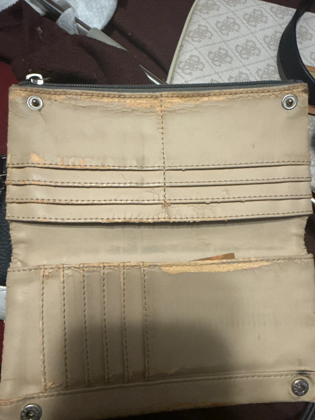 Selling a Guess wallet. It's black with a patterned design and the Guess logo on the front. It has several compartments inside. i’m located at Lawrence and Overture check my other listing please.
